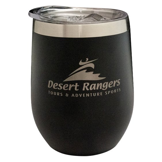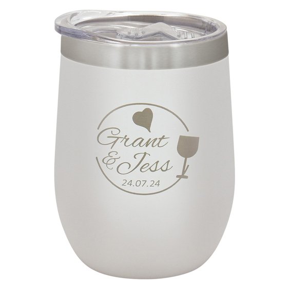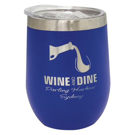 A 350ml stainless steel double wall wine tumbler with powder coated finish and sliding lid for tumbler engraving. The curved body and smooth coated exterior provide a defined surface suited to laser marking while maintaining insulated performance.