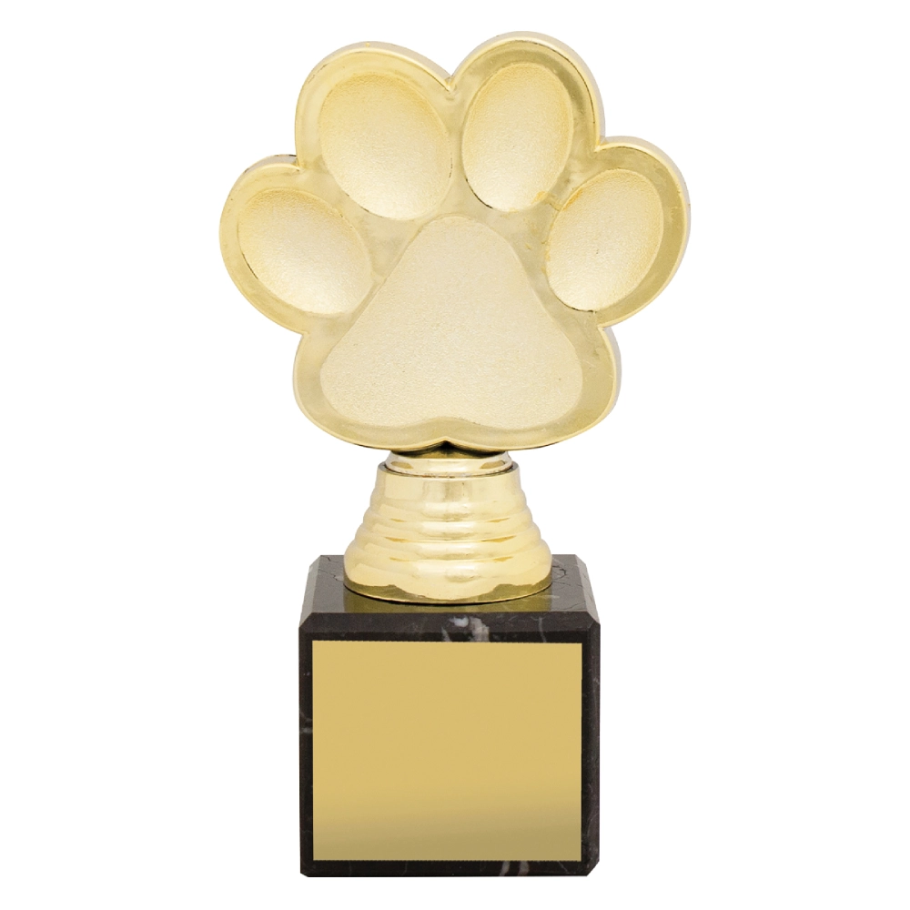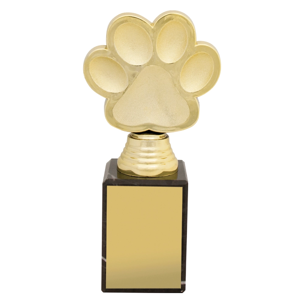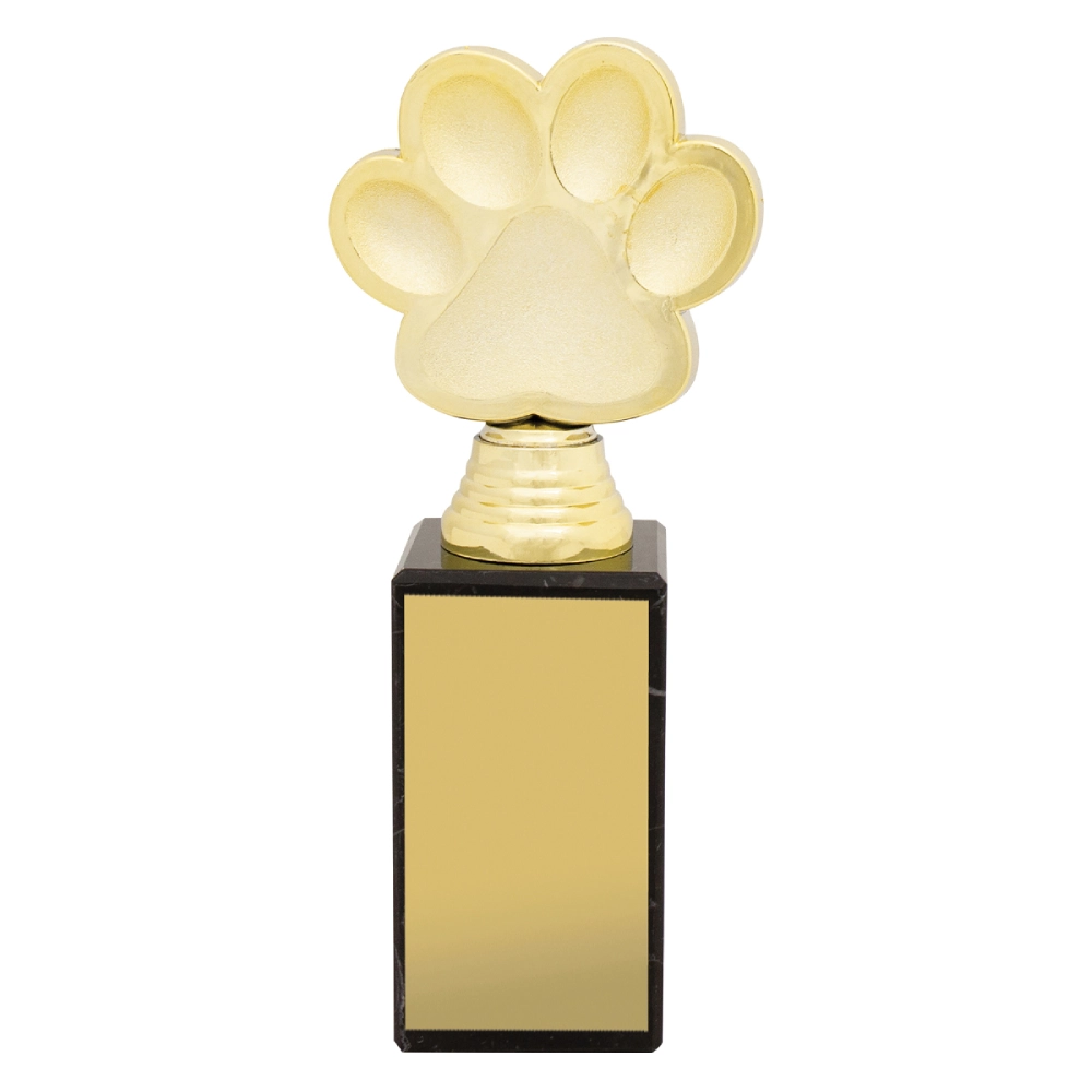 A raised paw form sits above a stepped marble base, with smooth contours defining each pad and edge. The structured silhouette keeps attention on the paw detail while maintaining balance for pet trophies.