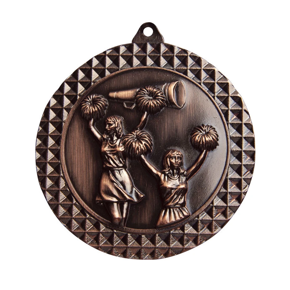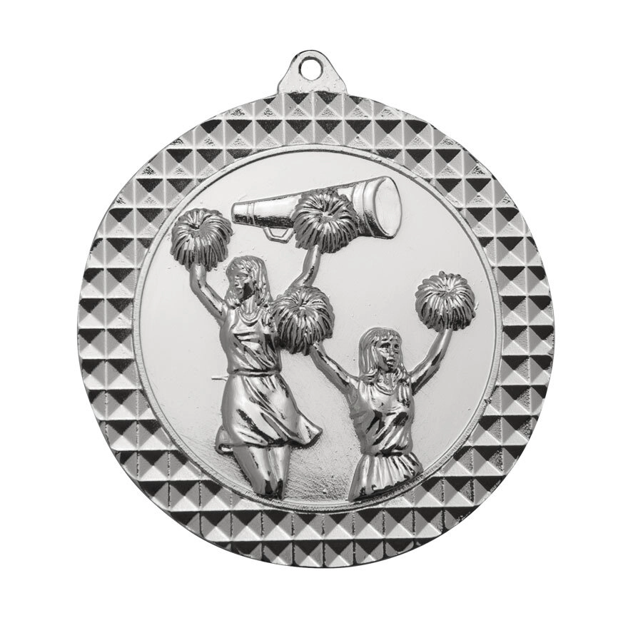 Cheerleading medals with raised cheerleaders holding pom poms and megaphone design on the front. Available in gold, silver, and bronze finishes with a blank reverse suitable for custom engraving.