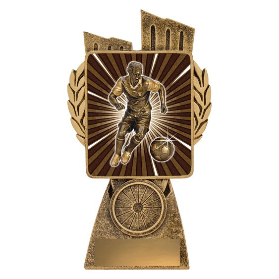 Resin trophy constructed with a tall vertical body featuring a male football figure in motion set within a framed panel and flanked by laurel detailing. The elongated form and layered surfaces create a strong upward emphasis common to soccer trophies.