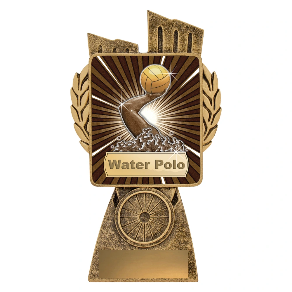 A tall geometric frame supports a raised water polo insert, with vertical fins and wreath detailing shaping the upper section for water polo trophies. Gold surfaces are layered across the body and base, keeping the central insert and engraving plate clearly defined.