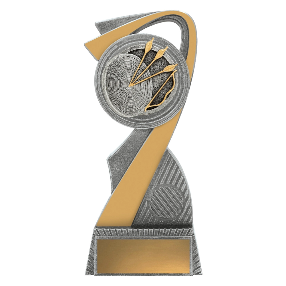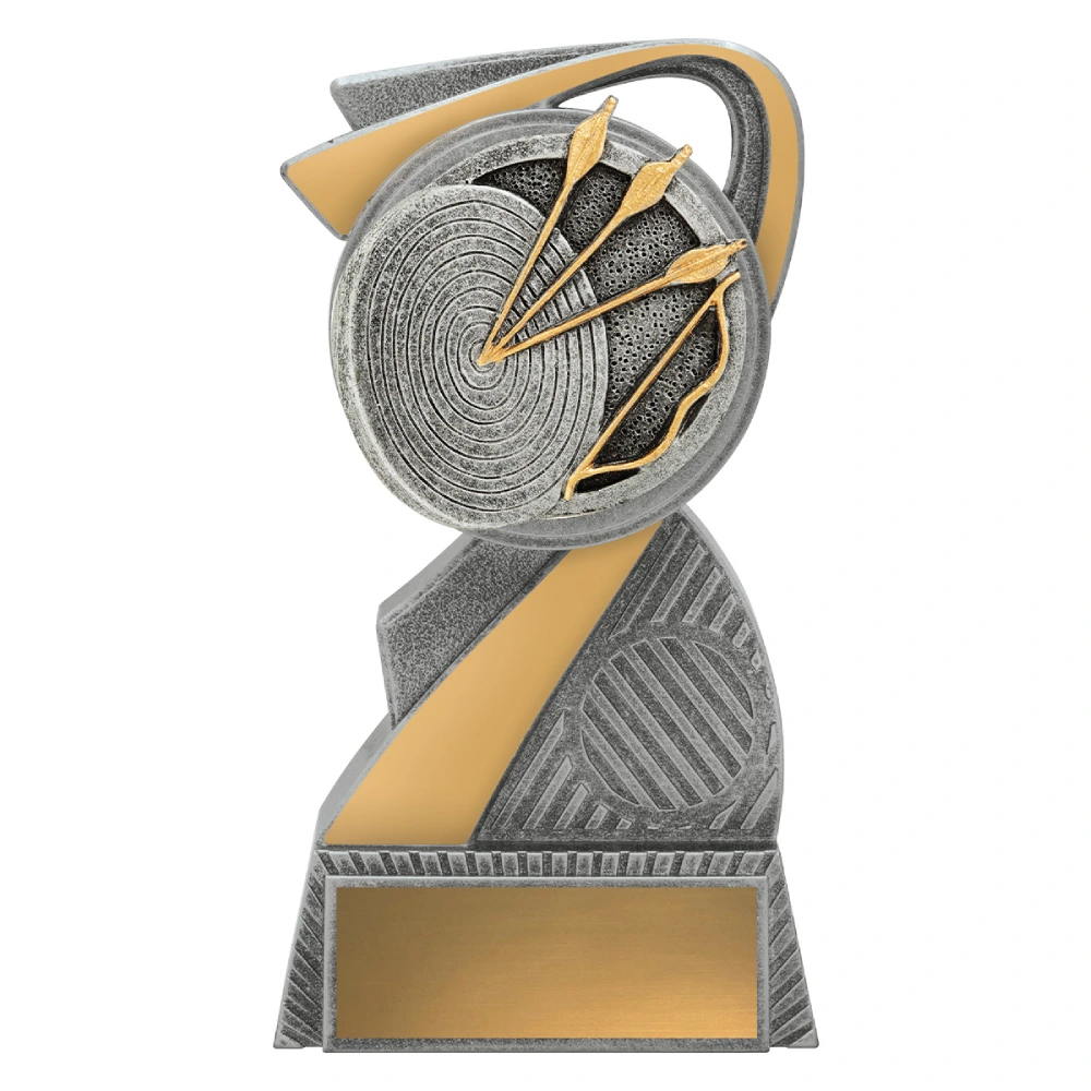 Curved intersecting panels frame a raised target and arrow detail, creating a vertical flow through the centre for archery trophies. Silver textures contrast with gold accents, giving the structure depth while keeping the base stable and defined.