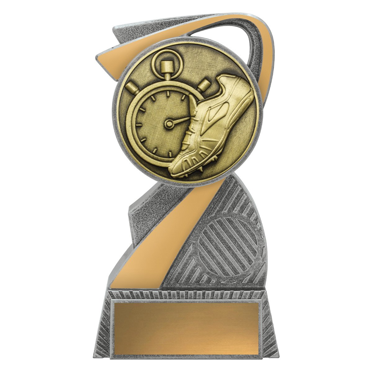 A sweeping arc frame wraps around a circular insert showing a running shoe and stopwatch for athletics trophies. The angled base and curved bands guide the eye upward while holding the central emblem in focus.