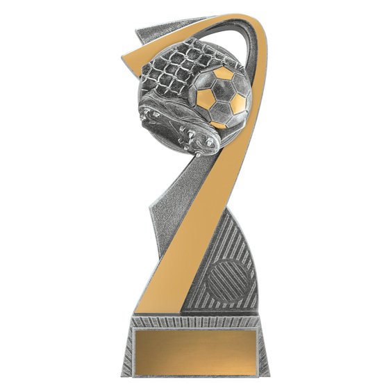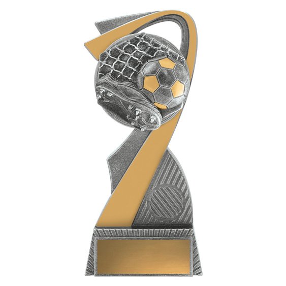 This trophy shows a dynamic curved frame with a football and boot detail in resin, consistent with modern soccer trophies. Antique silver tones highlight the textured panels, and a front insert provides space for a custom logo to suit club and team awards.