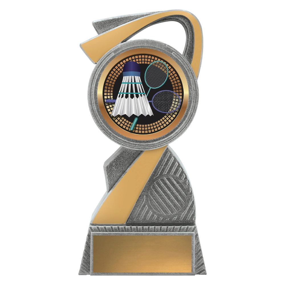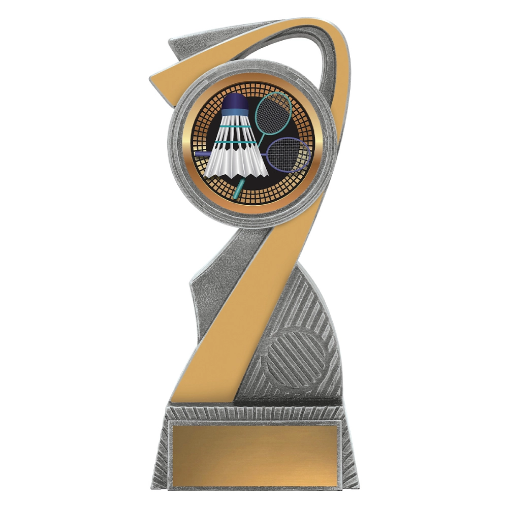 Arclight Showtime badminton trophies with curved silver frame and colour badminton insert. Antique silver plastic design with engraving plate on the base for award details. Affordable badminton trophy suitable for school events, club competitions and participation awards.