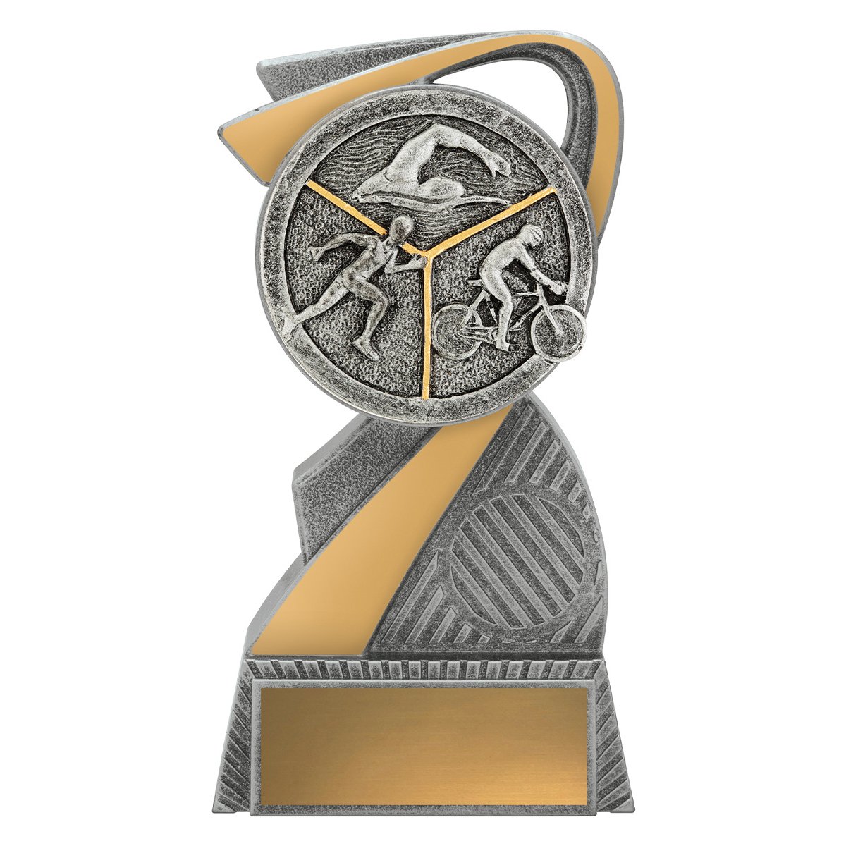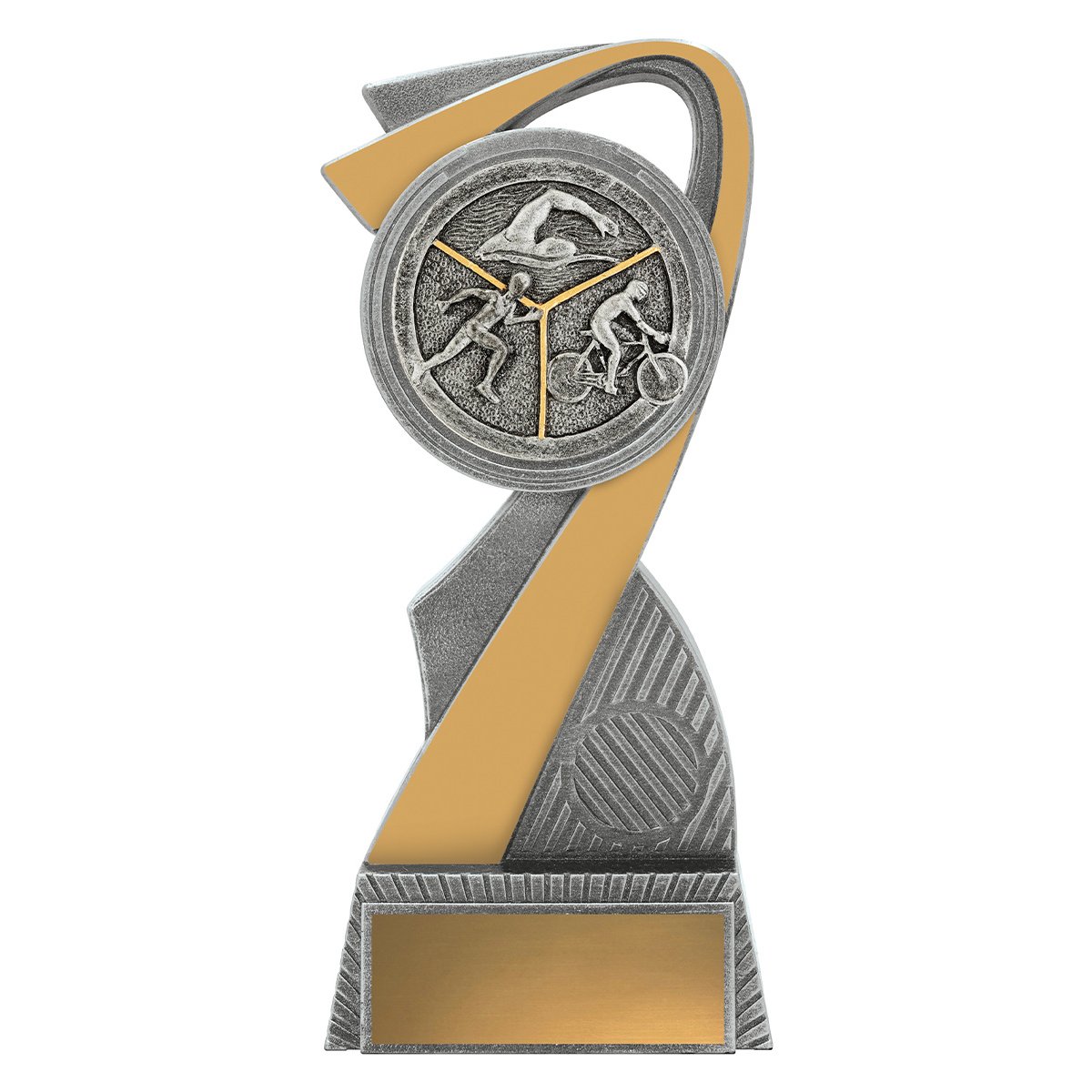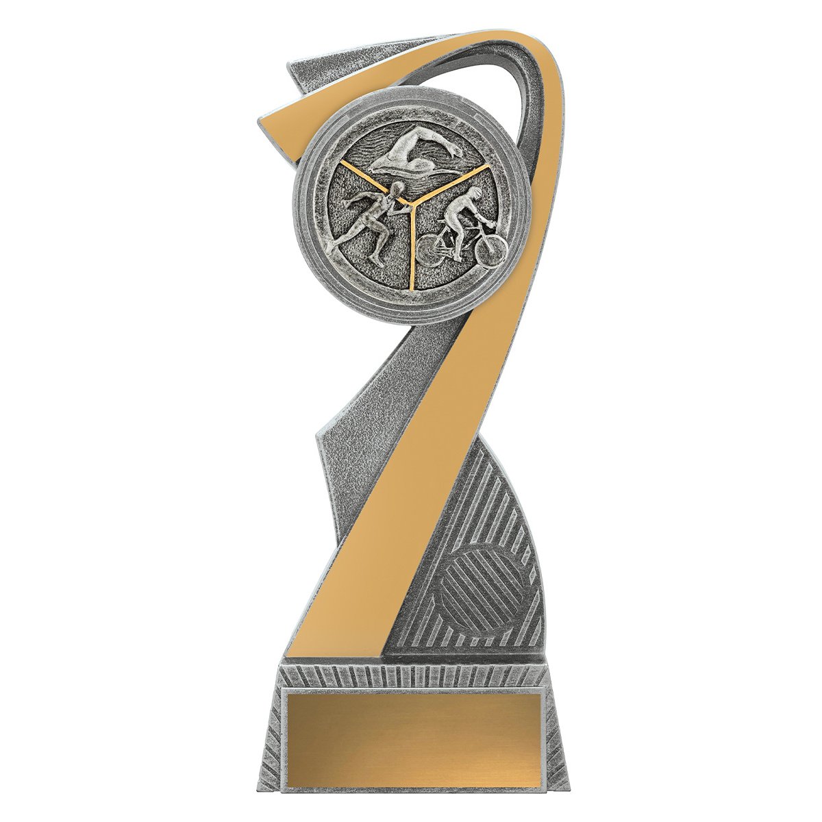 Curved arc form wraps around a central triathlon medallion featuring swimming, cycling, and running elements in resin construction. Layered contours and vertical structure create a balanced option for triathlon trophies.