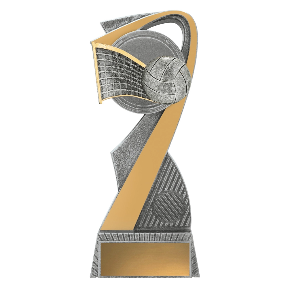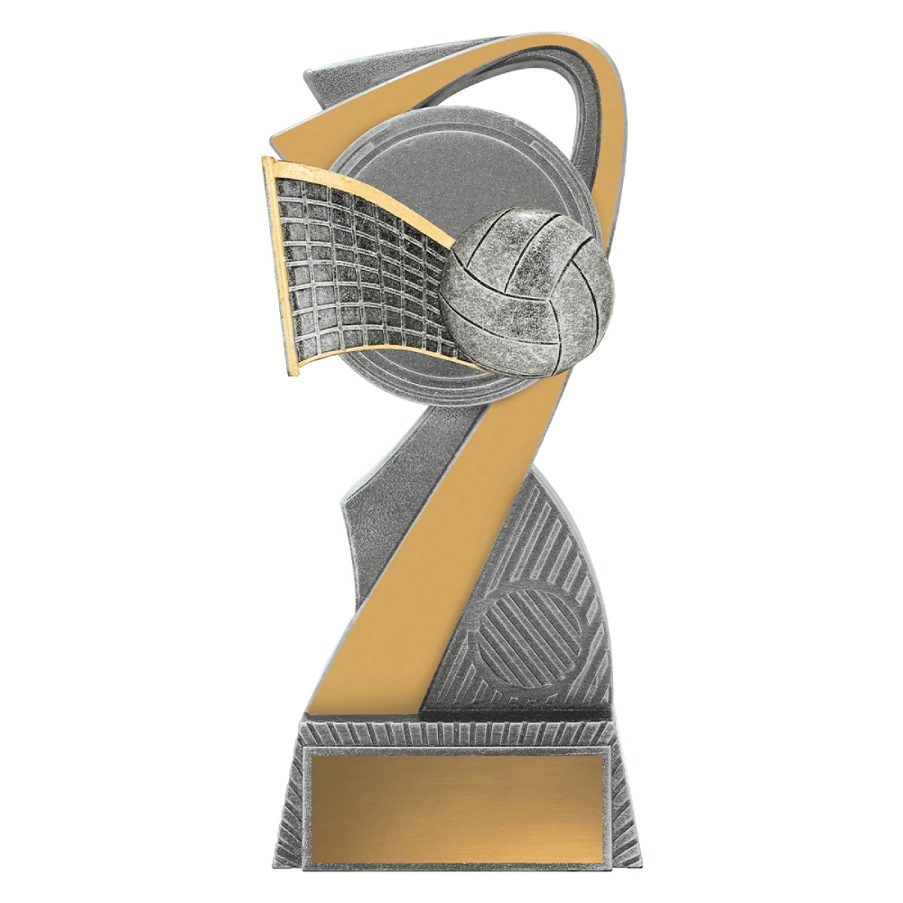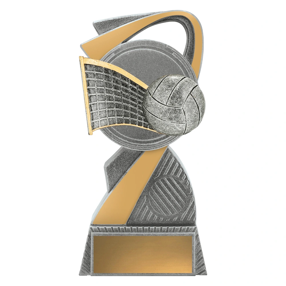 A sweeping arc frame supports a raised volleyball and net panel across the upper section for volleyball trophies. Silver finish with subtle gold accents maintains vertical flow while the base remains compact and stable.