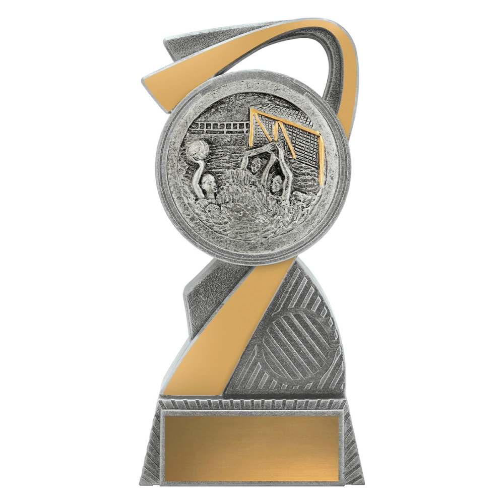 An angled arc form wraps around a raised water polo insert, creating forward movement through the centre for water polo trophies. Textured silver surfaces contrast with a single gold panel, keeping the structure clean and directing focus toward the circular insert.