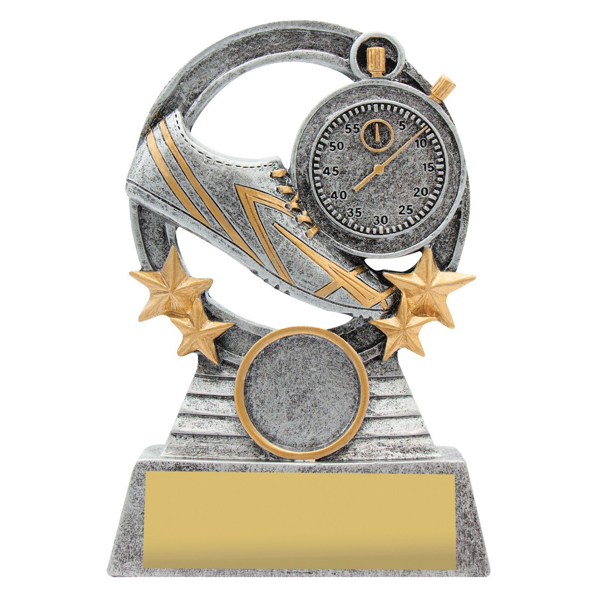 A curved comet frame wraps around a running shoe and stopwatch motif that centres the composition for athletics trophies. The star accents and circular insert create a layered structure while the base keeps the form balanced.