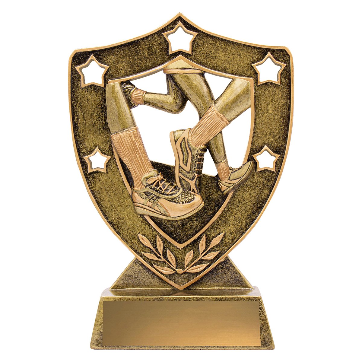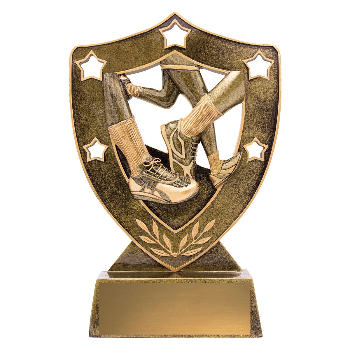 A shield form frames the running shoe and leg motif within a raised panel for athletics trophies. The curved crest and star accents guide the eye across the face while the base plate supports the structured resin form.