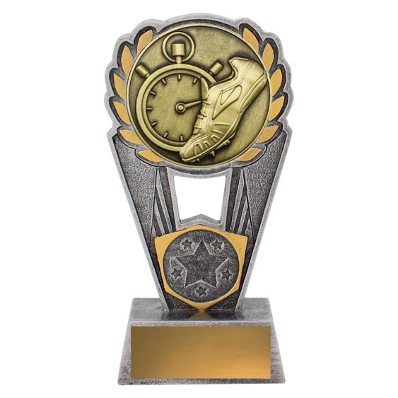 Layered shield panels rise beneath a circular stopwatch and running shoe medallion, forming a compact upright structure for athletics trophies. The framed opening and lower star emblem add depth while the upper medallion remains the dominant visual element in the design.