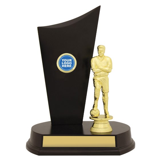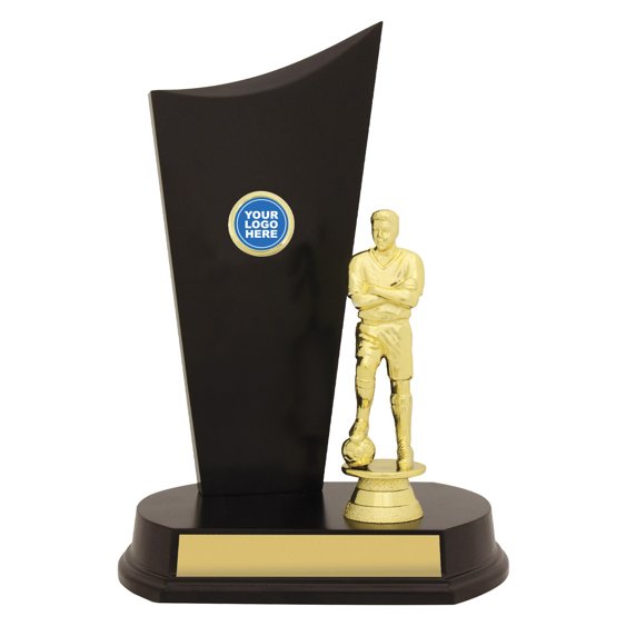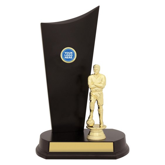 Tall trophy formed with a curved vertical panel mounted to a wide circular base and paired with a standing football figure. The contrast between the smooth black surface and the sculpted figure places the piece within soccer trophies.