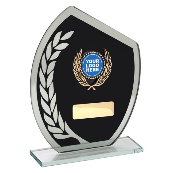 Black wreath glass awards constructed with a shield shaped glass panel featuring a black infill field, silver laurel detailing, and a centred logo insert, mounted on a flat clear glass base. The balanced proportions and contrasting finishes align with the formal presentation style used across recognition awards.