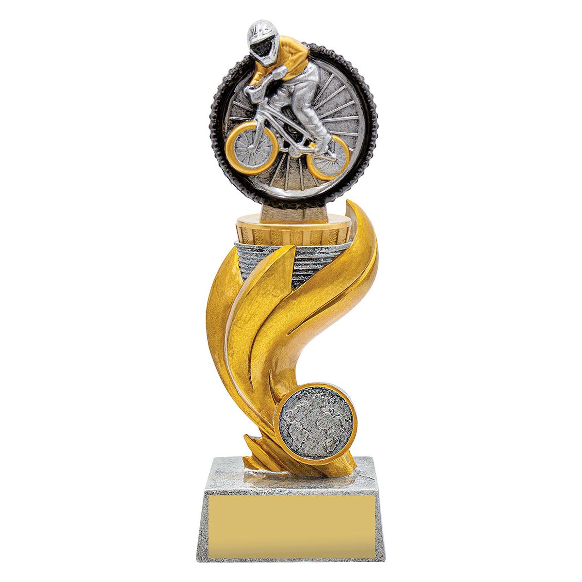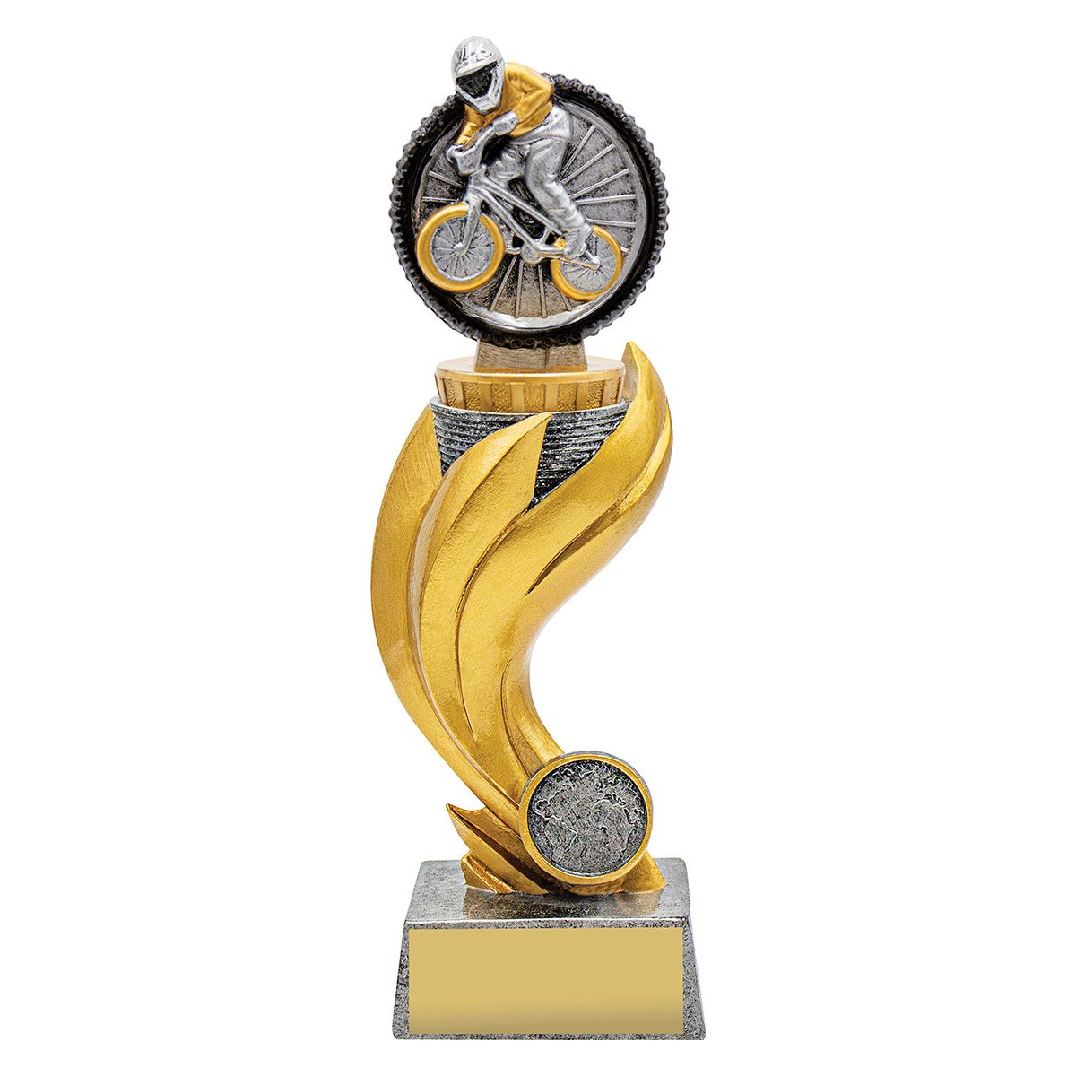 A BMX rider wheel medallion rises above a curved flame shaped column that sweeps upward from the base and frames the circular top element. Silver surfaces and gold accents follow the curved structure, giving the form a sense of upward motion for bmx trophies.