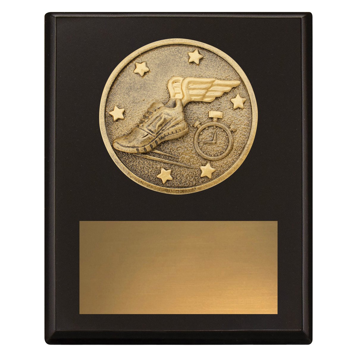 A circular athletics medallion sits within a rectangular timber plaque for athletics trophies. The dark plaque surface frames the raised emblem while the lower section supports the engraving plate.