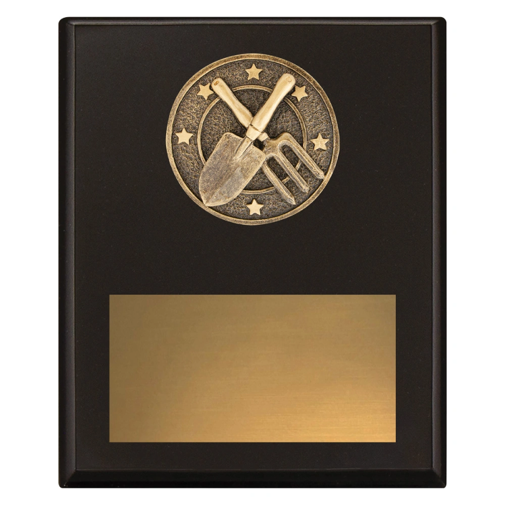The circular medallion sits centred on the flat plaque surface, keeping the crossed tools as the primary visual focus for gardening trophies. The dark timber background contrasts with the antique gold medallion, while the lower plate aligns with the overall rectangular format to maintain a balanced layout.