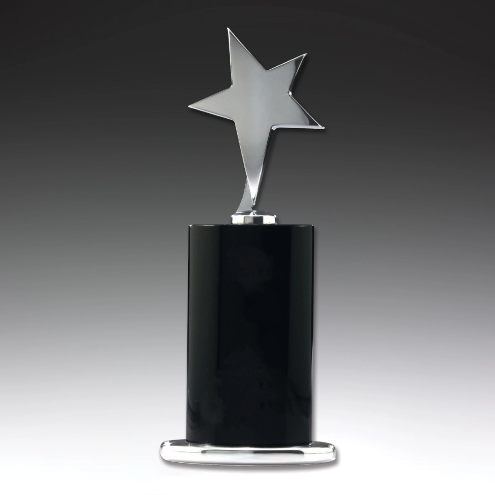 Crystal star tower award features a polished star design mounted on a sleek black column base with a silver trim. Part of the CIP Crystal Awards range, this premium piece suits corporate awards, business recognition, and achievement presentations. Supplied in a presentation gift box.
