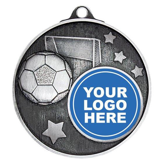 A circular metal medal featuring raised boot and ball elements with a defined 25mm insert space for soccer medals. The textured background and structured outer rim frame the central logo area in a contained presentation format.