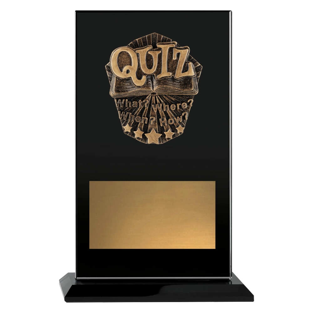 Black glass panel supports raised quiz emblem detailing, mounted on a rectangular base designed for engraving. Gloss surface and defined proportions create a formal option for trivia trophies.