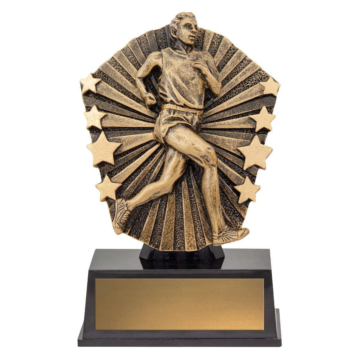 A forward running figure sits against a burst of radiating panels that spread outward from the centre for athletics trophies. The compact form keeps the layered design tight above the rectangular base, giving the trophy a balanced and contained structure.
