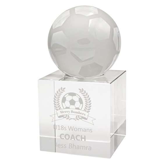 Clear crystal cube base supports a spherical crystal ball seated on a flat upper plane, with clean edges and balanced proportions. The rotating ball and solid mass give controlled movement and visual weight typical of sculptural soccer trophies.