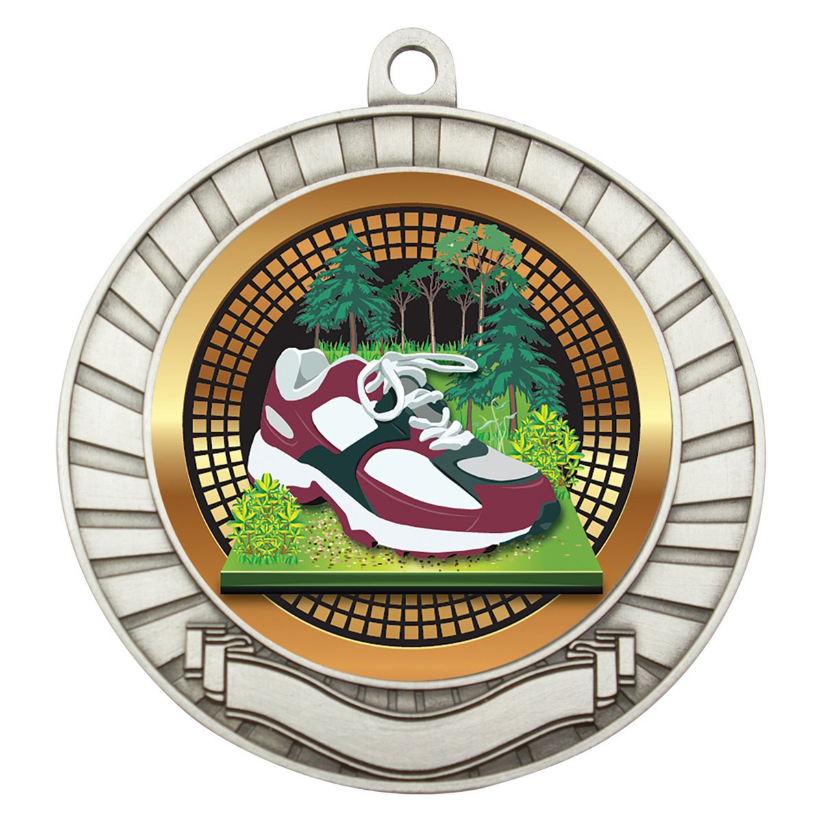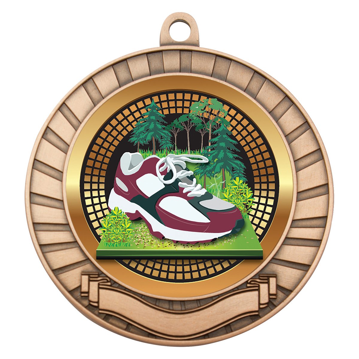 A wide circular frame surrounds the large centre insert while the lower scroll panel balances the medal face for athletics medals. Segmented outer bands guide the eye toward the insert area and keep the structure evenly weighted.