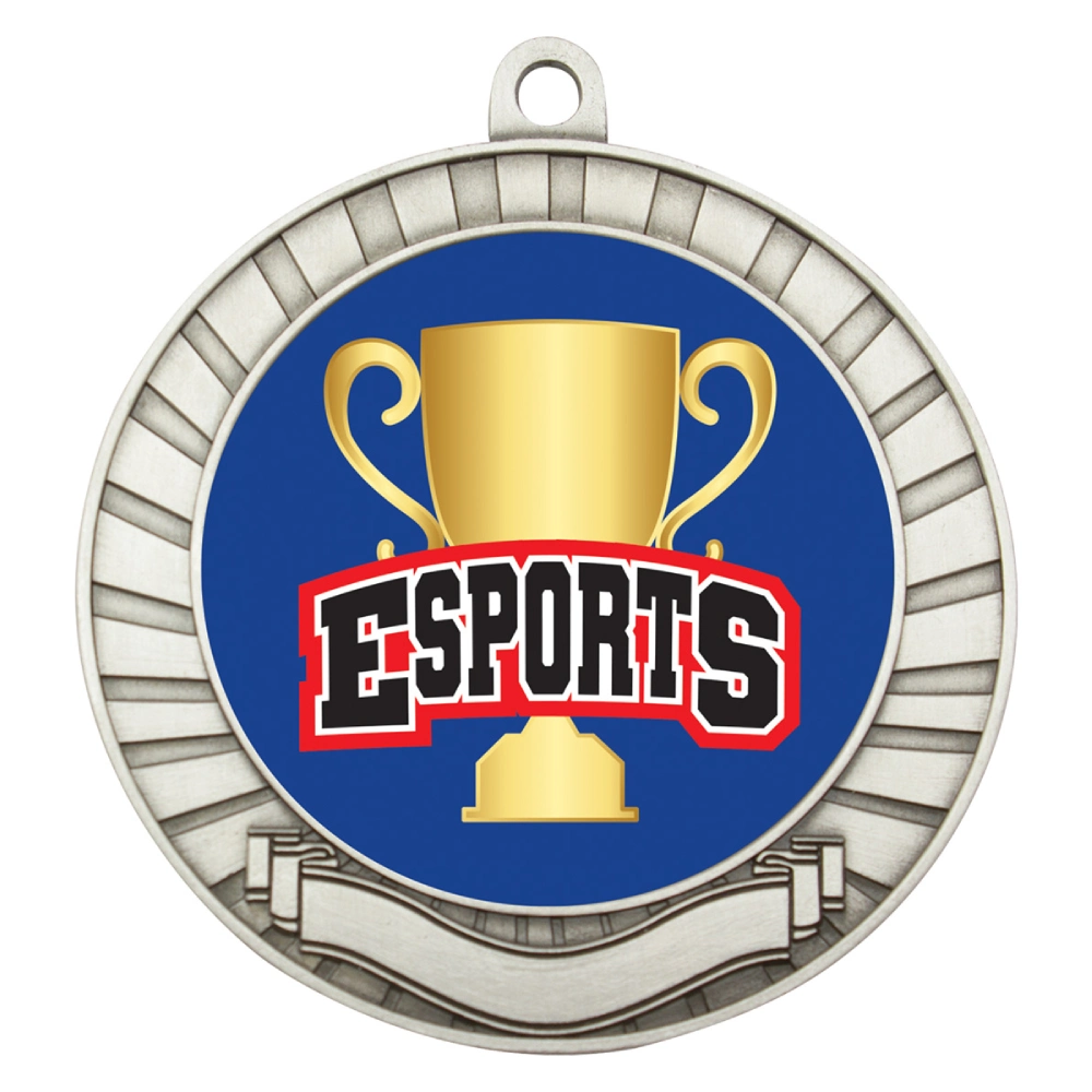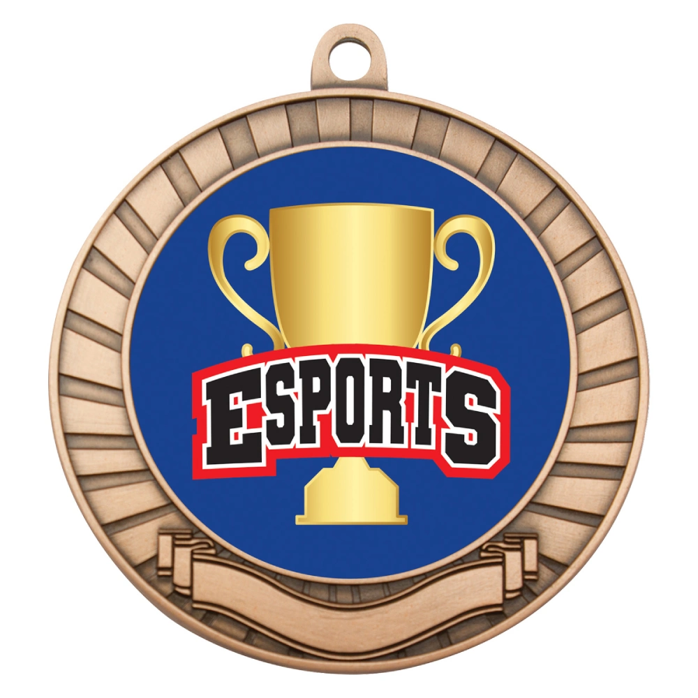 A 70 mm metal medal featuring a 50 mm insert set within a bold circular frame for esports trophies. Radiating outer lines and a lower scroll detail frame the centre while the rear supports engraving.
