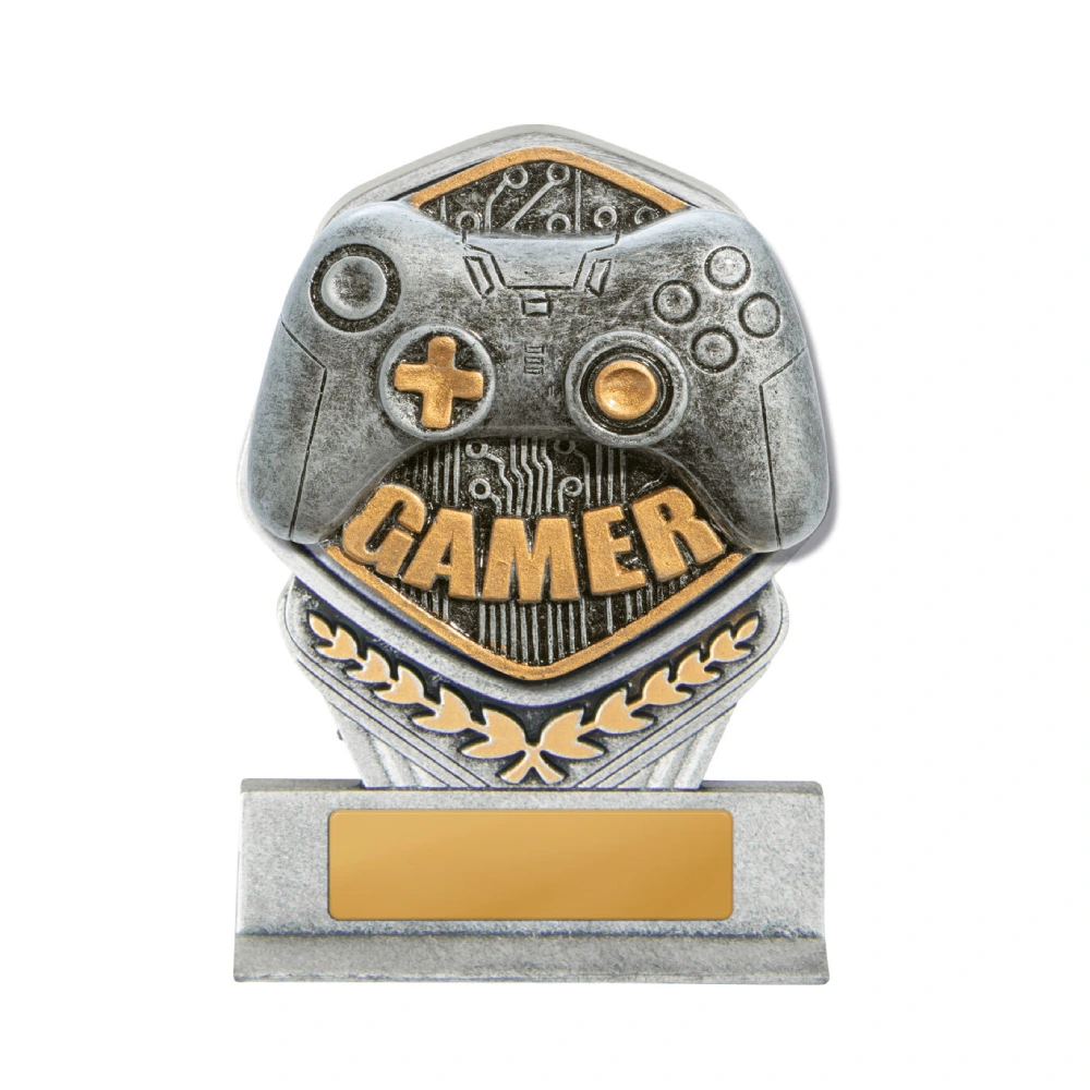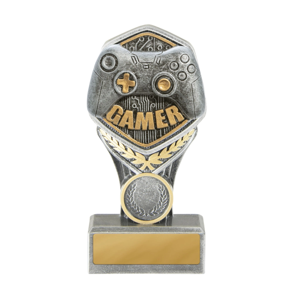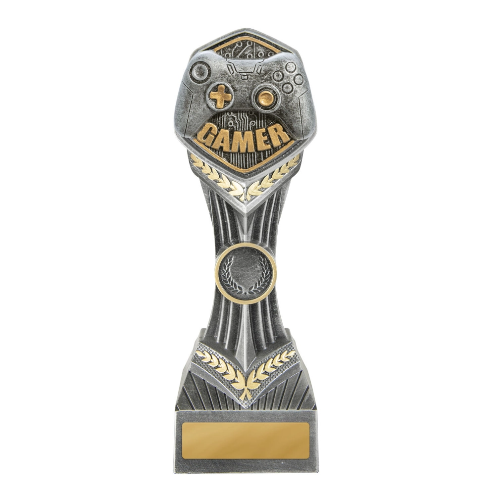 A tall segmented tower rises through stacked panels, guiding the eye upward toward the central insert holder for gaming trophies. Clean silver and gold accents define each section, keeping the overall form structured and clear.