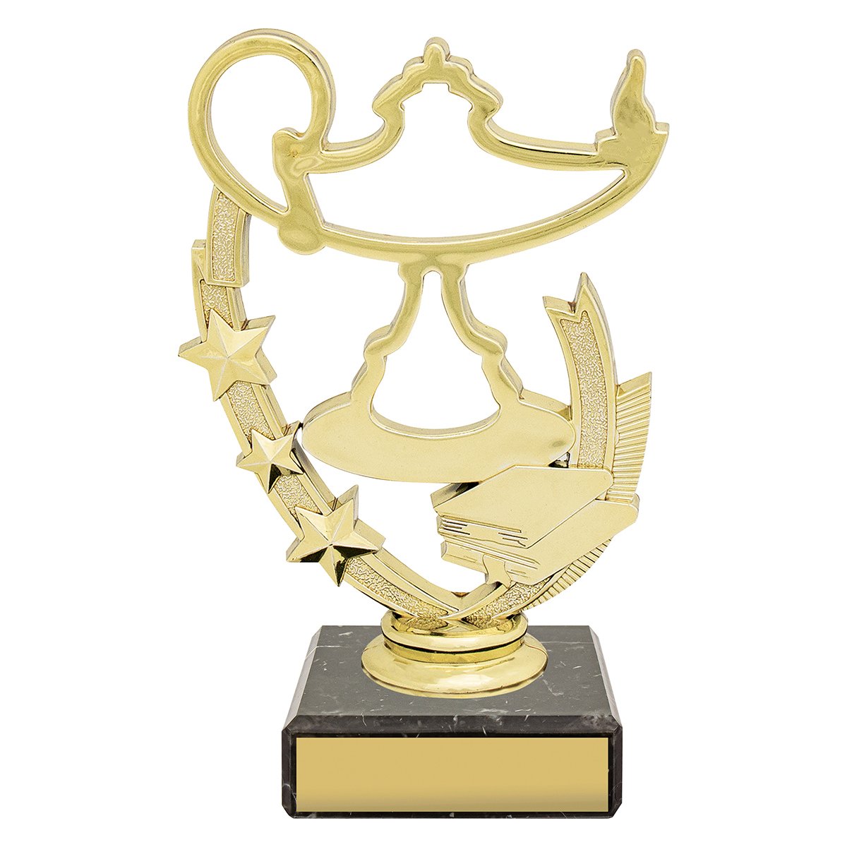 A bright gold academic lamp figure rises from a curved star frame above a square marble base for academic trophies. The layered stars and book detail frame the centre form while the marble base provides space for engraving.