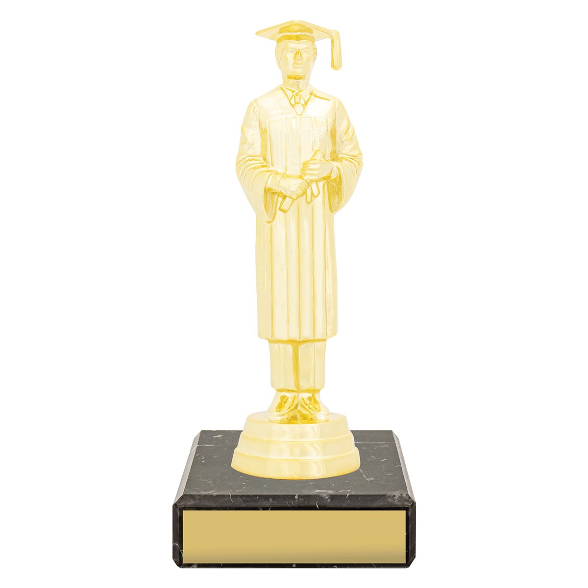 A standing graduate figure in cap and gown rises above a square marble base for academic trophies. The upright pose and compact base create a clear presentation form while the front panel provides space for engraving.