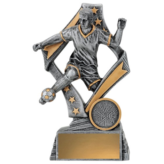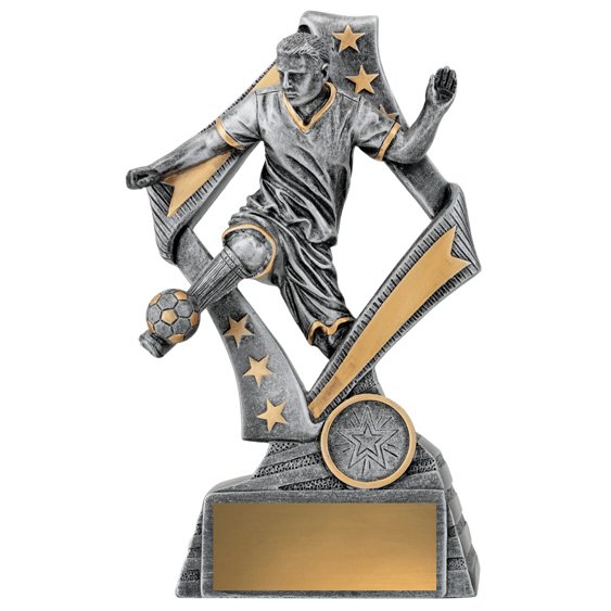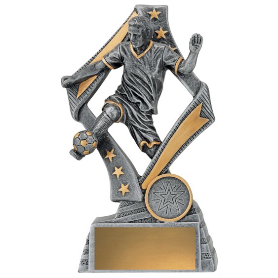 Forward motion is emphasised through angled framing and a raised player figure, creating a sense of energy common in modern soccer trophies. Antique silver and gold accents keep the finish clean and balanced.