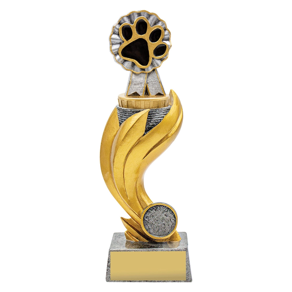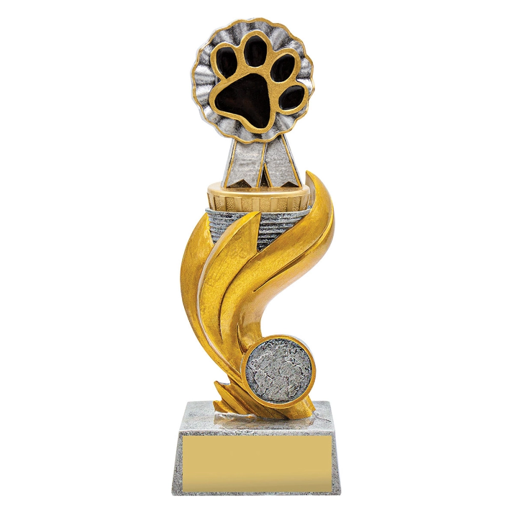 A sweeping flame form rises from a marble style base to support a rosette paw motif top with silver and gold detailing. The curved structure and balanced proportions create a defined presentation for pet trophies.