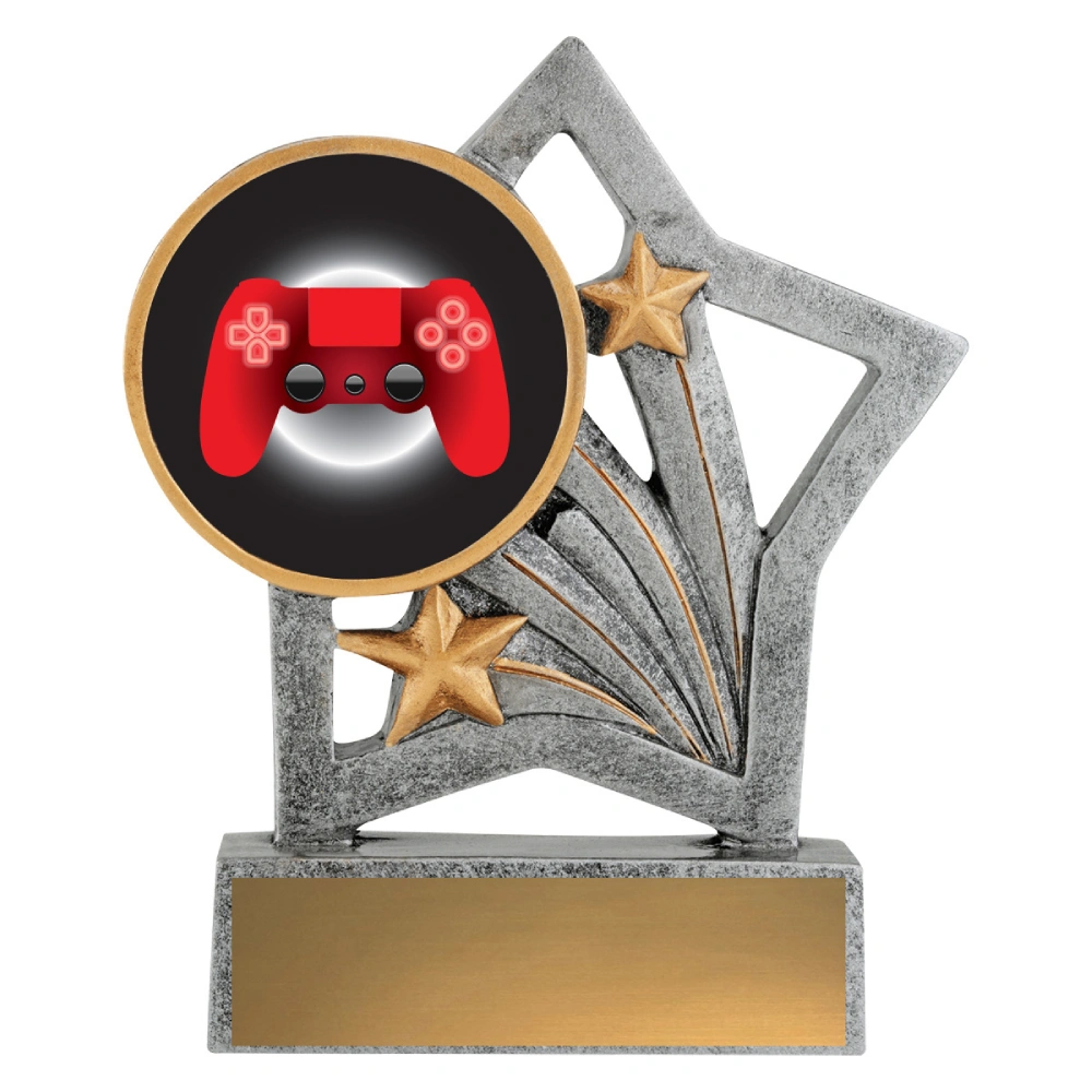A compact resin holder award featuring a 25 mm insert frame set within a star shaped structure for gaming trophies. Curved lines and raised star elements guide the eye toward the central gaming emblem while maintaining a balanced base for engraving.