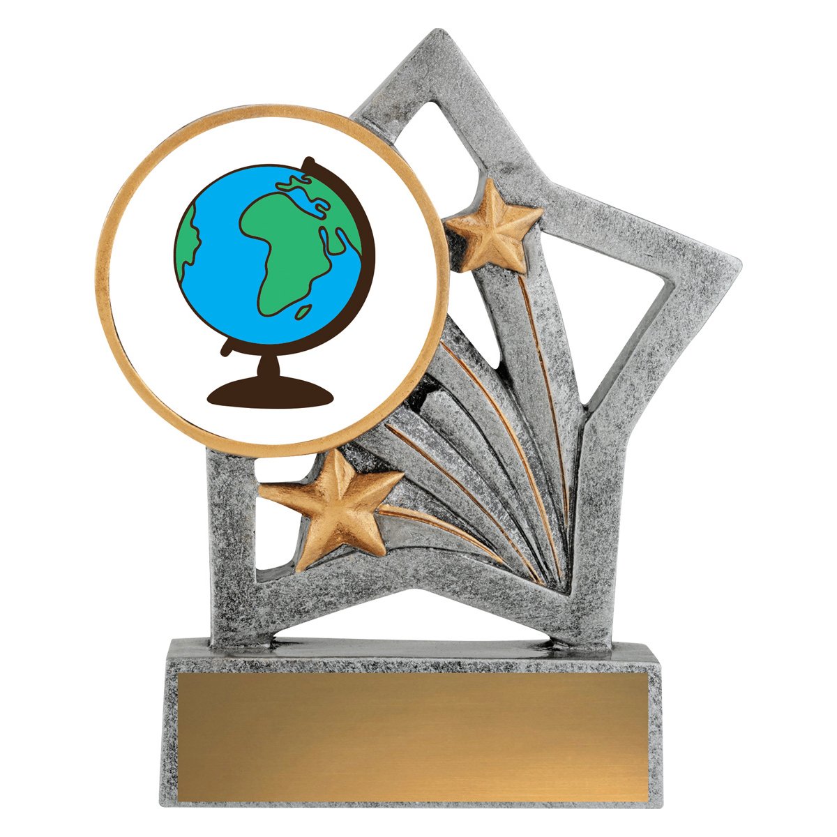 A star shaped frame with sweeping lines holds a circular globe themed insert above a rectangular base for academic trophies. The angled star points and layered streaks guide attention toward the insert while the base plate provides space for engraving.