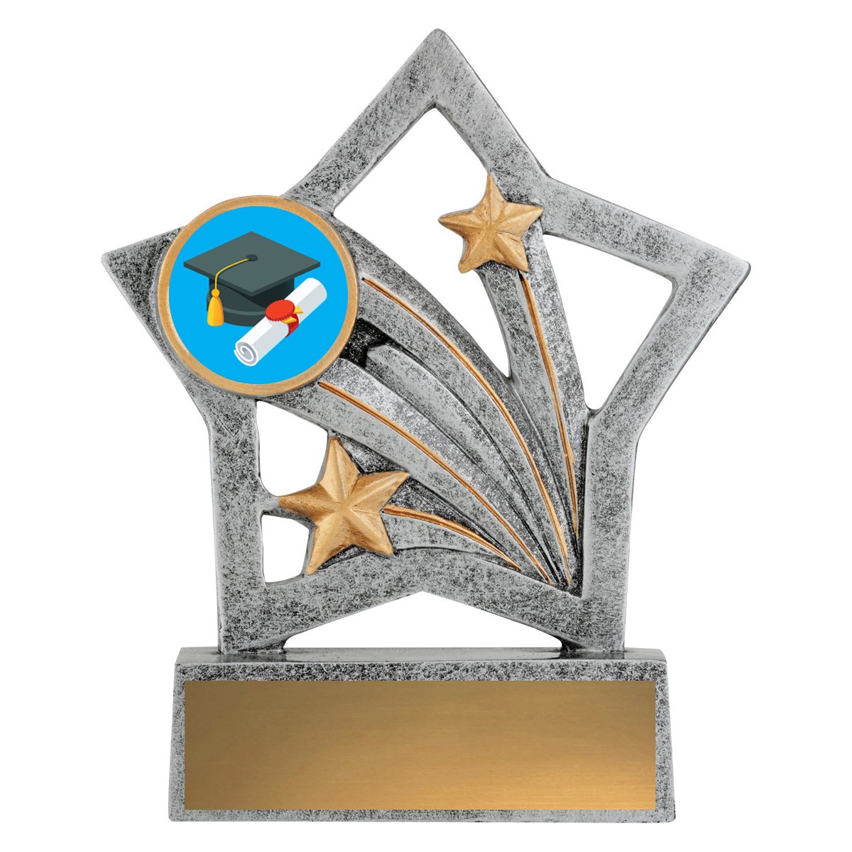 A star shaped frame with sweeping lines holds a circular graduate insert above a rectangular base for academic trophies. The angled star points and layered streaks draw focus toward the insert while the base plate provides space for engraving.