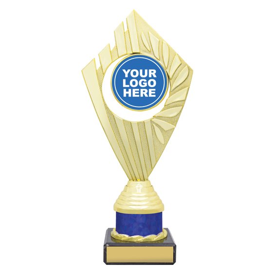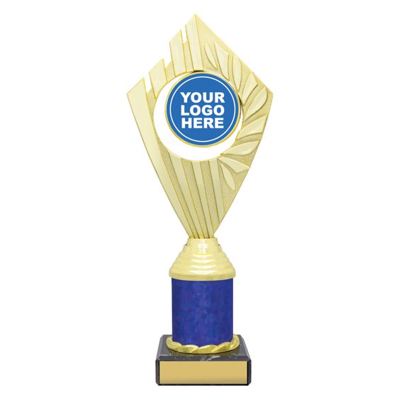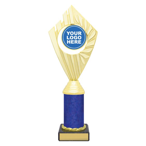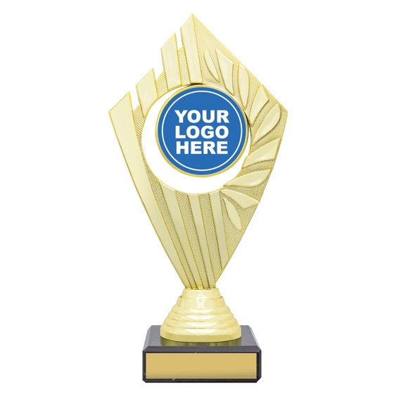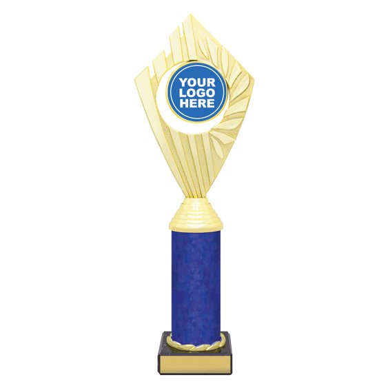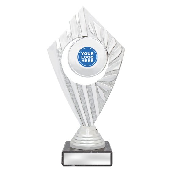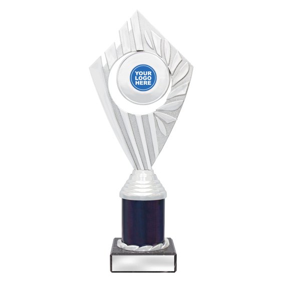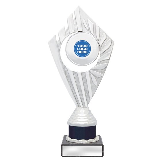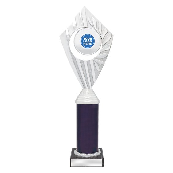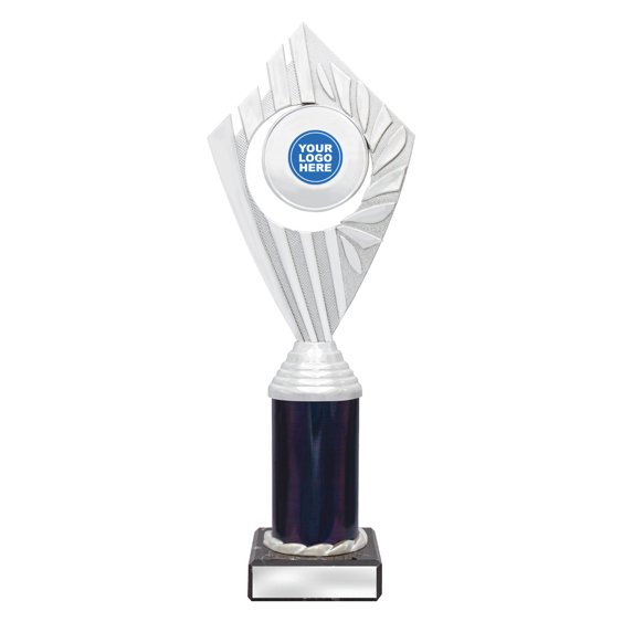 Angular silver holder panels rise from a black column to frame a central insert position for cheerleading trophies. The vertical structure builds height through five scaled proportions.