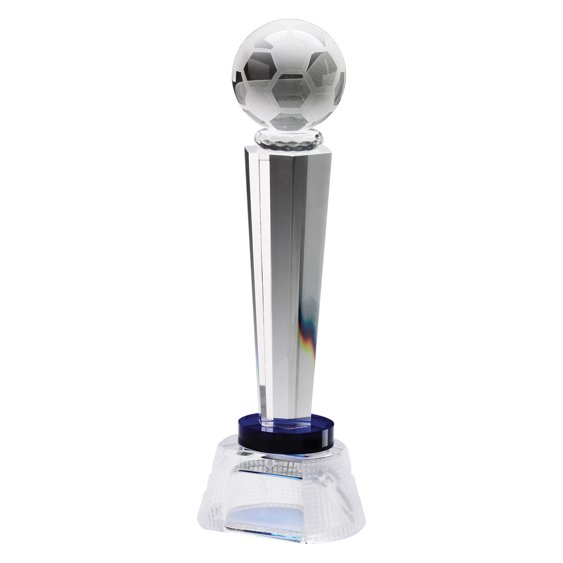 Tall crystal column rises from a faceted base with etched action silhouettes, finished with a spherical crystal ball seated at the top. The vertical tower and contrasting pedestal create a strong upward emphasis consistent with structured soccer trophies.