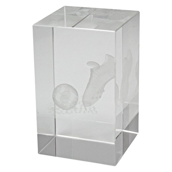Rectangular crystal block with clean vertical faces and internal etched football and boot forms suspended within the clear body. The solid proportions and smooth surface treatment create depth and clarity typical of precision finished soccer trophies.