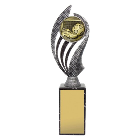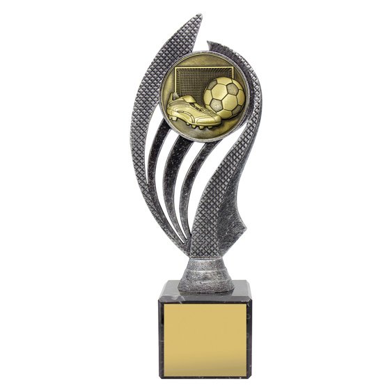 Tall trophy with a curved vertical frame supporting a circular football insert above a solid base. The layered materials and balanced proportions place the piece within soccer trophies.