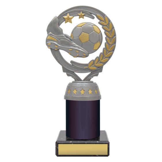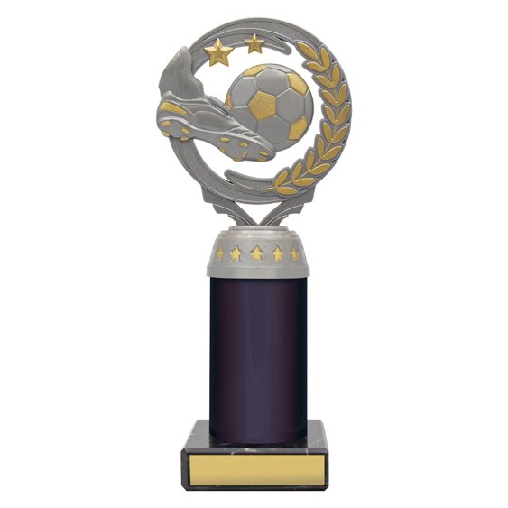 Compact trophy constructed with a tapered top and sculptural torch motif mounted on a glossy black column that supports a centred football insert. The vertical emphasis, balanced proportions, and refined detailing align with presentation style seen across soccer trophies.