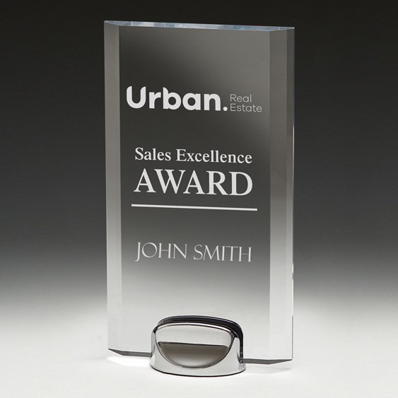 Rectangular acrylic award mounted to a polished metal base with a broad central engraving panel for corporate awards. The 15mm thick freestanding structure provides a balanced presentation suited to corporate awards in Sutherland Shire and Miranda.