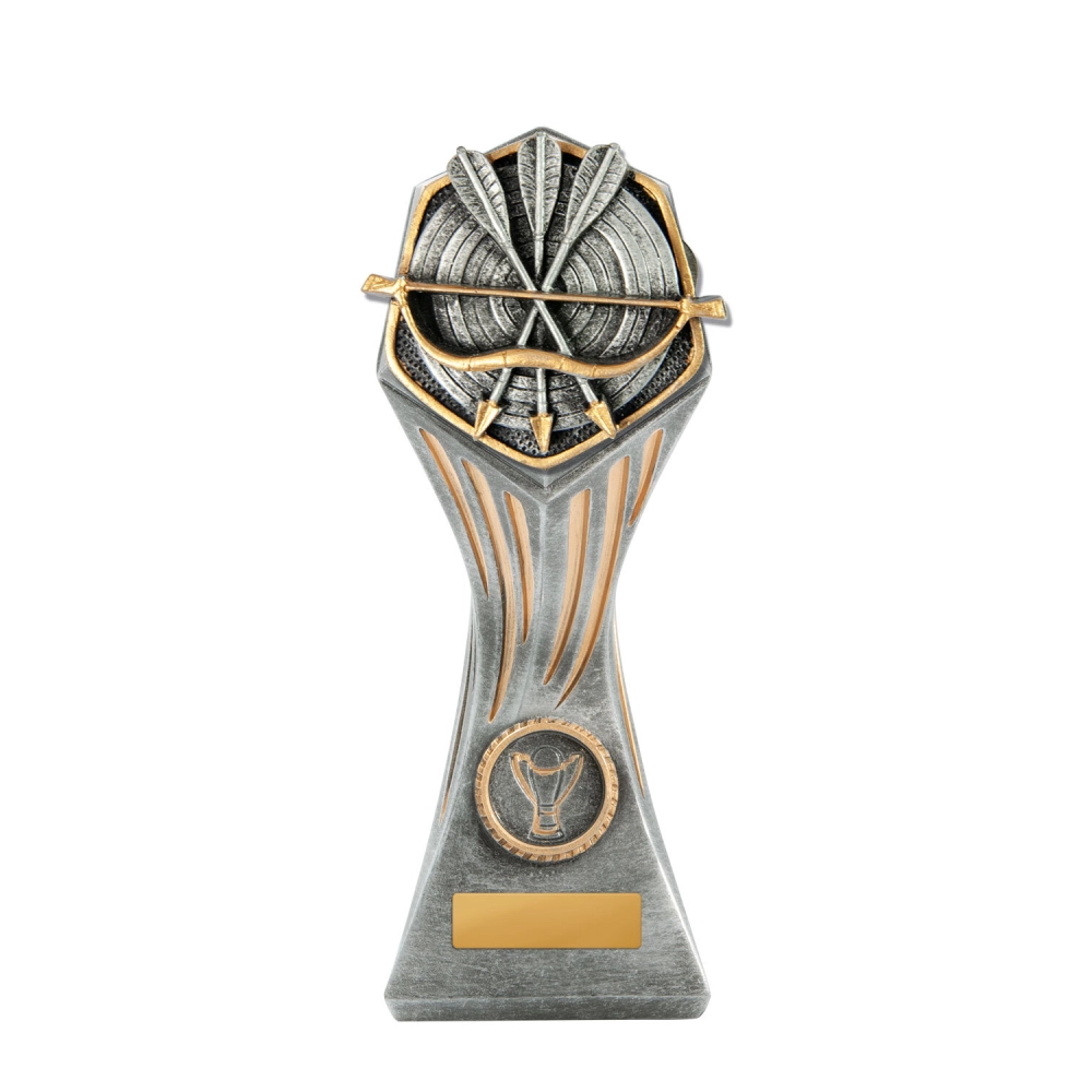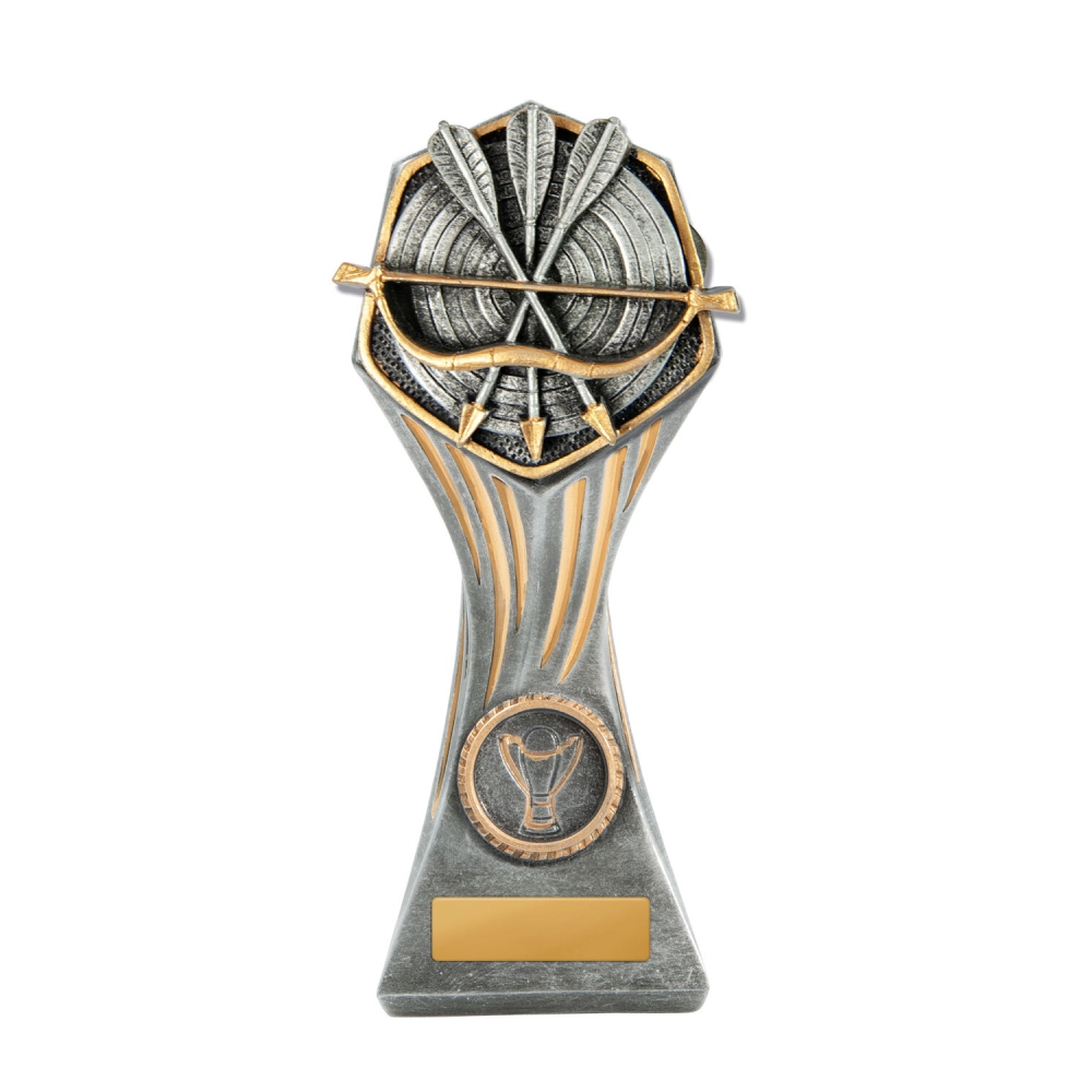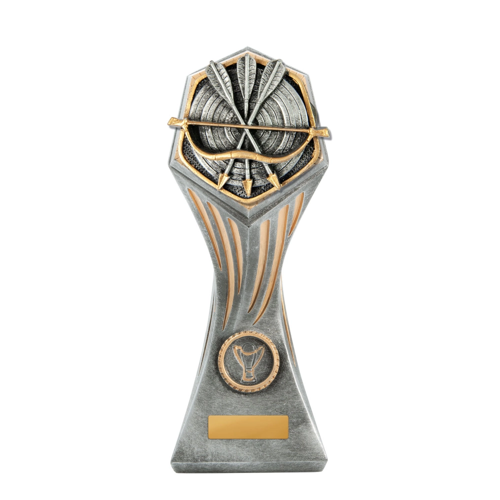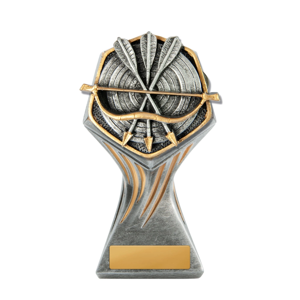 Crossed arrows and a bow form the central motif against a circular target background for archery trophies. The shield shaped frame and layered base keep the composition balanced while separating the engraving plate area from the upper design.