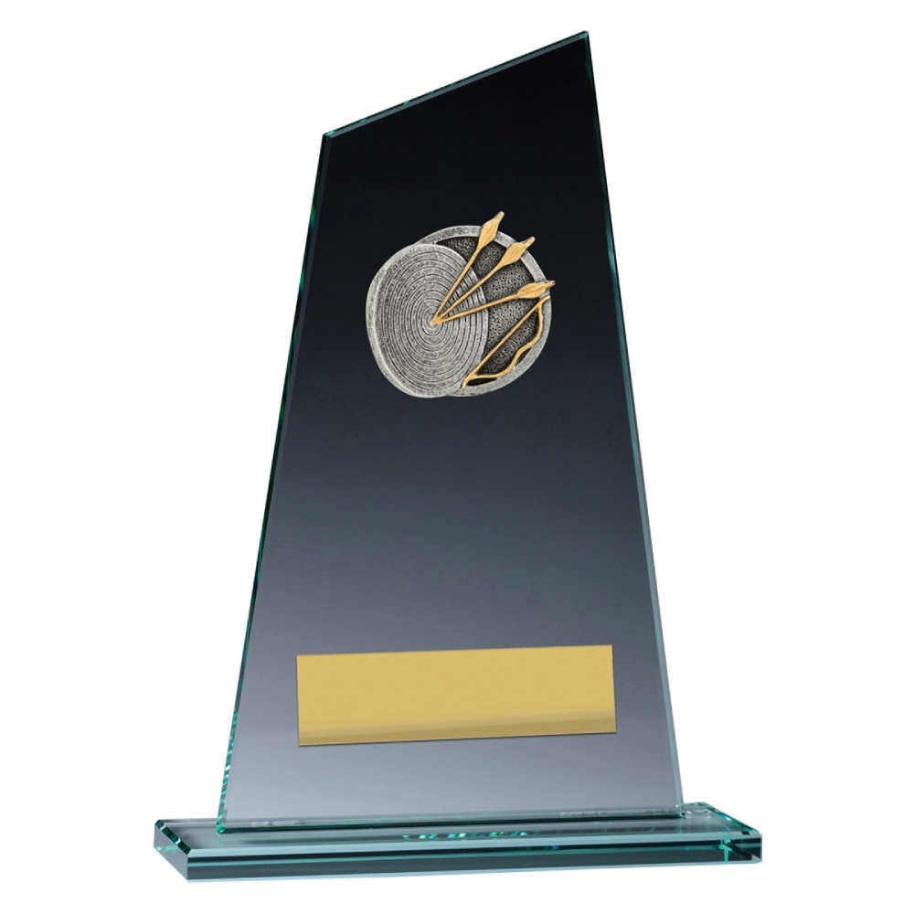 A tall glass panel rises from a clear base, with the raised target and arrow emblem positioned toward the upper section for archery trophies. The smooth surface keeps the structure clean and open, leaving a wide engraving area across the lower portion.
