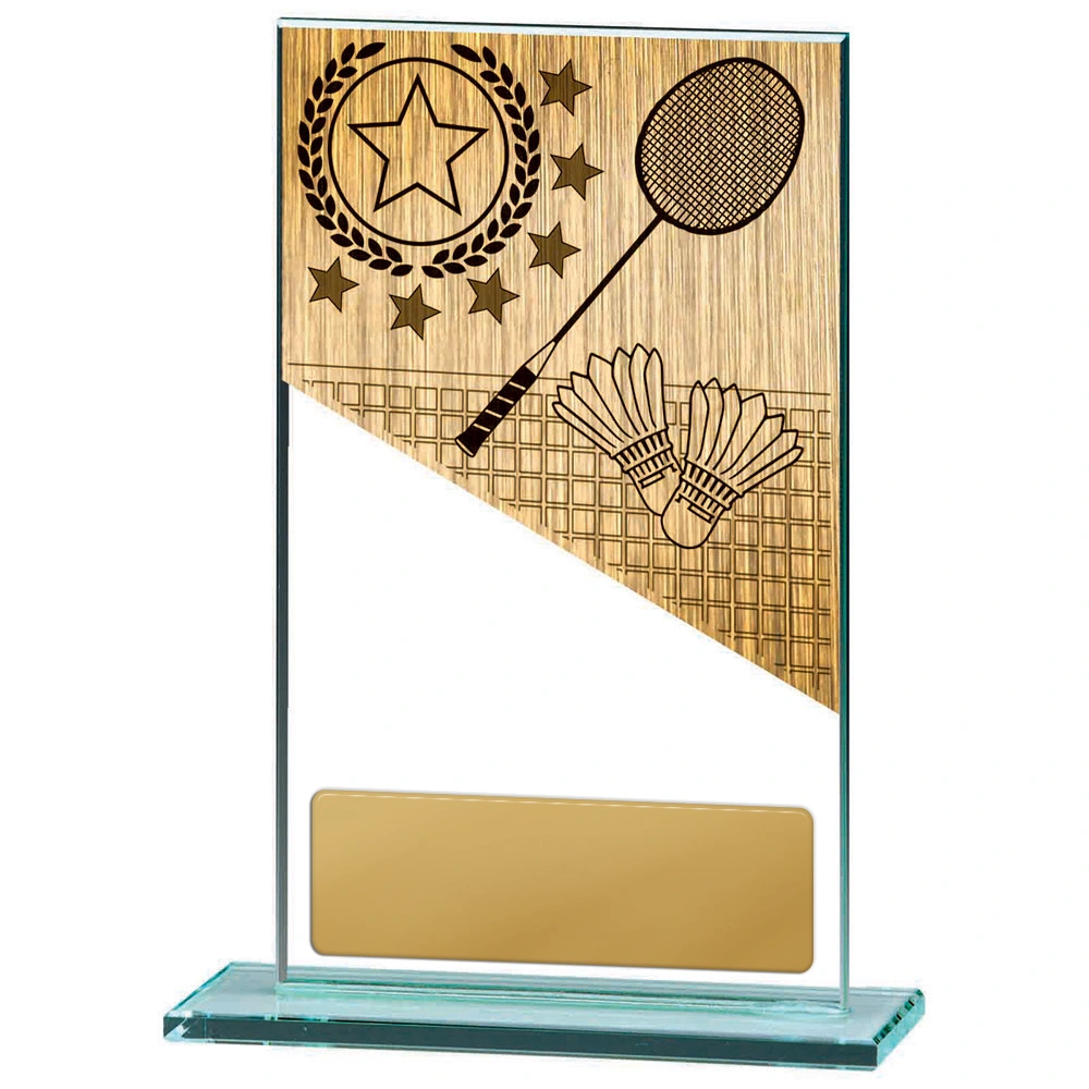 A clear glass panel stands upright on a matching base, with a gold badminton graphic showing a racket, shuttlecocks, and star emblem for badminton trophies. The angled layout separates the illustration from the engraving plate area, keeping the plaque structured and easy to read.