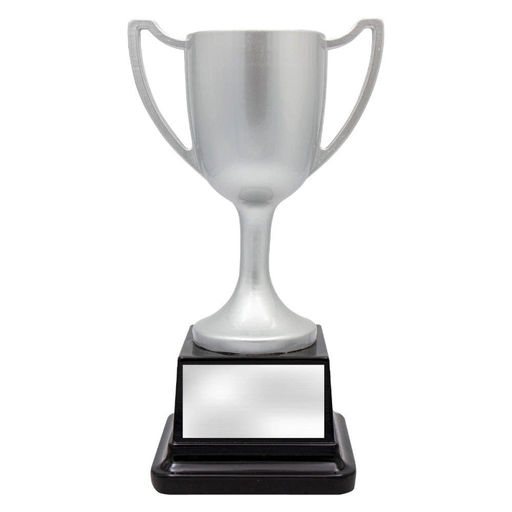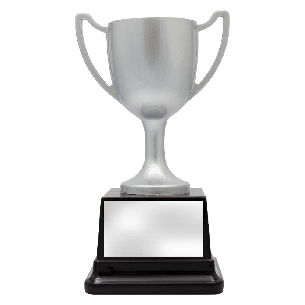 Traditional silver cup trophy with twin handles and black base. Clean, classic design suited for corporate awards and recognition awards.