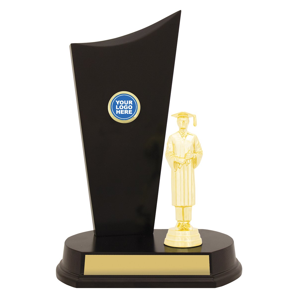 A tall curved timber panel rises behind a small graduate figure on a rounded base for academic trophies. The broad timber face allows space for a logo insert while the front plate provides clear engraving area.