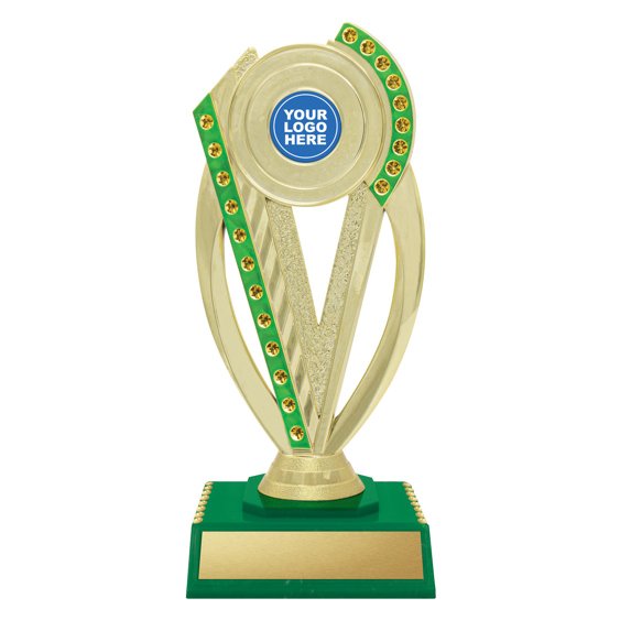 Curved vertical panels frame a circular insert holder, mounted on a coloured base for dance trophies. The layered structure and defined plate area create a clear presentation format for achievement trophies in Sutherland Shire and Miranda.