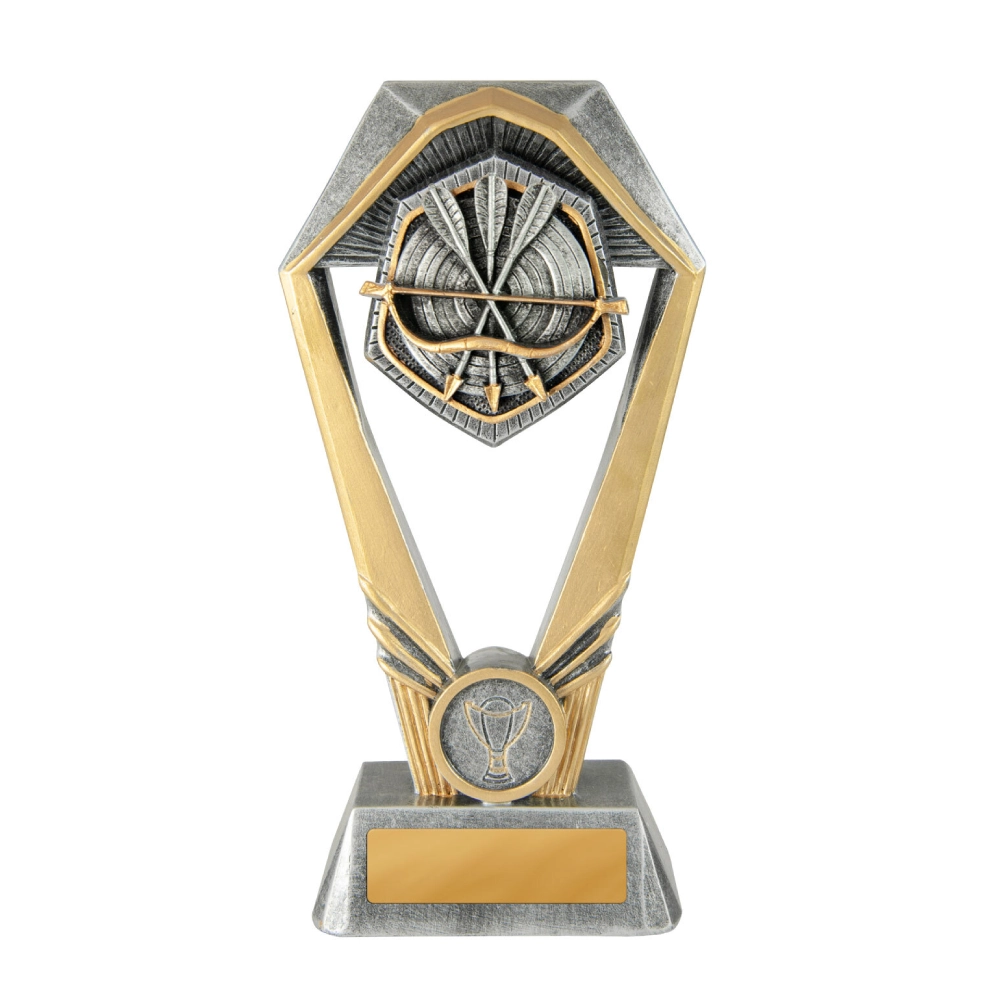 A hexagonal frame surrounds crossed arrows and a bow set against a circular target pattern for archery trophies. The open centre structure lifts the emblem above the base while separating the engraving plate area below.