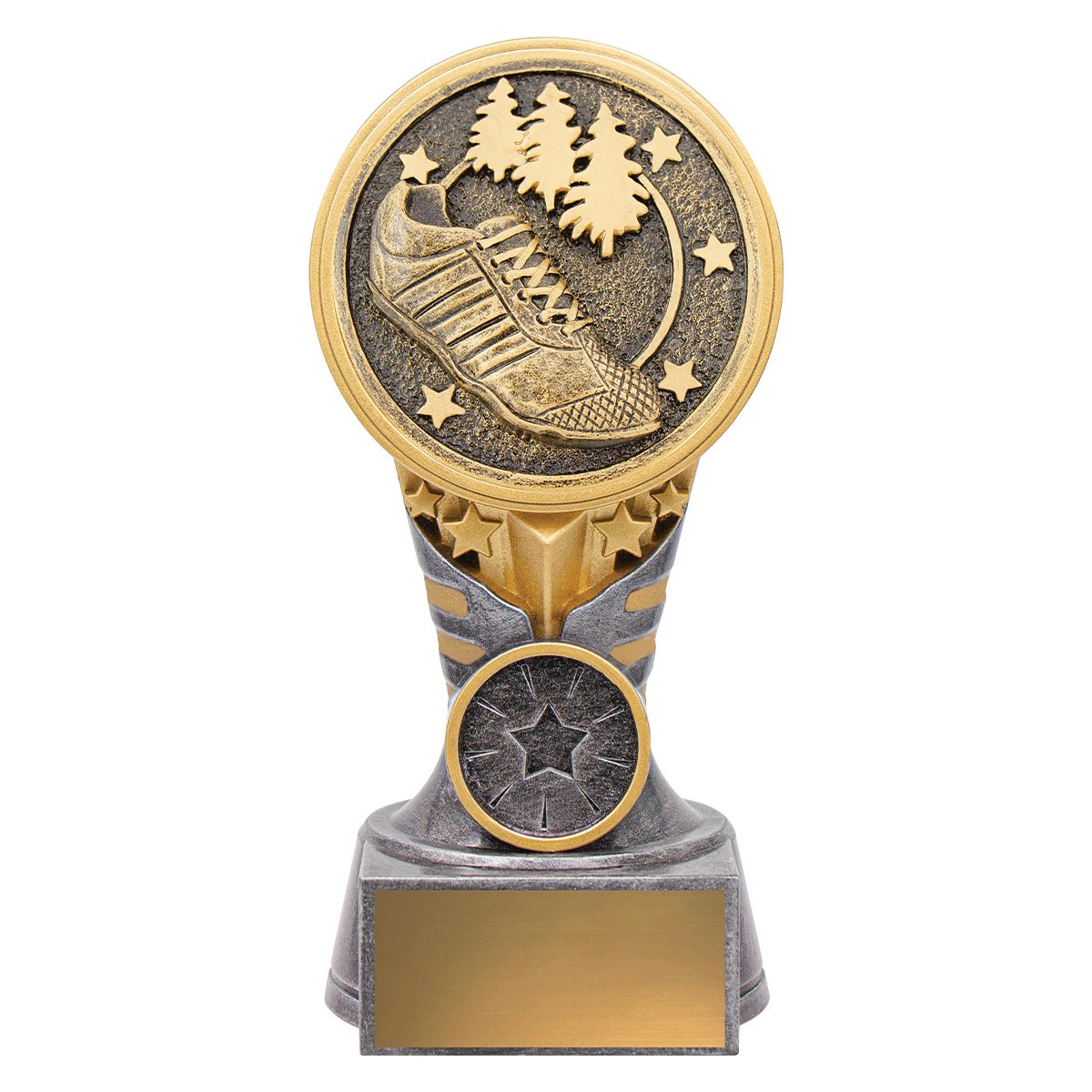 A tall column supports a circular cross country medallion with running shoe and trail scene for athletics trophies. Textured silver surfaces with gold accents rise through the structure while the wide base anchors the engraving plate.