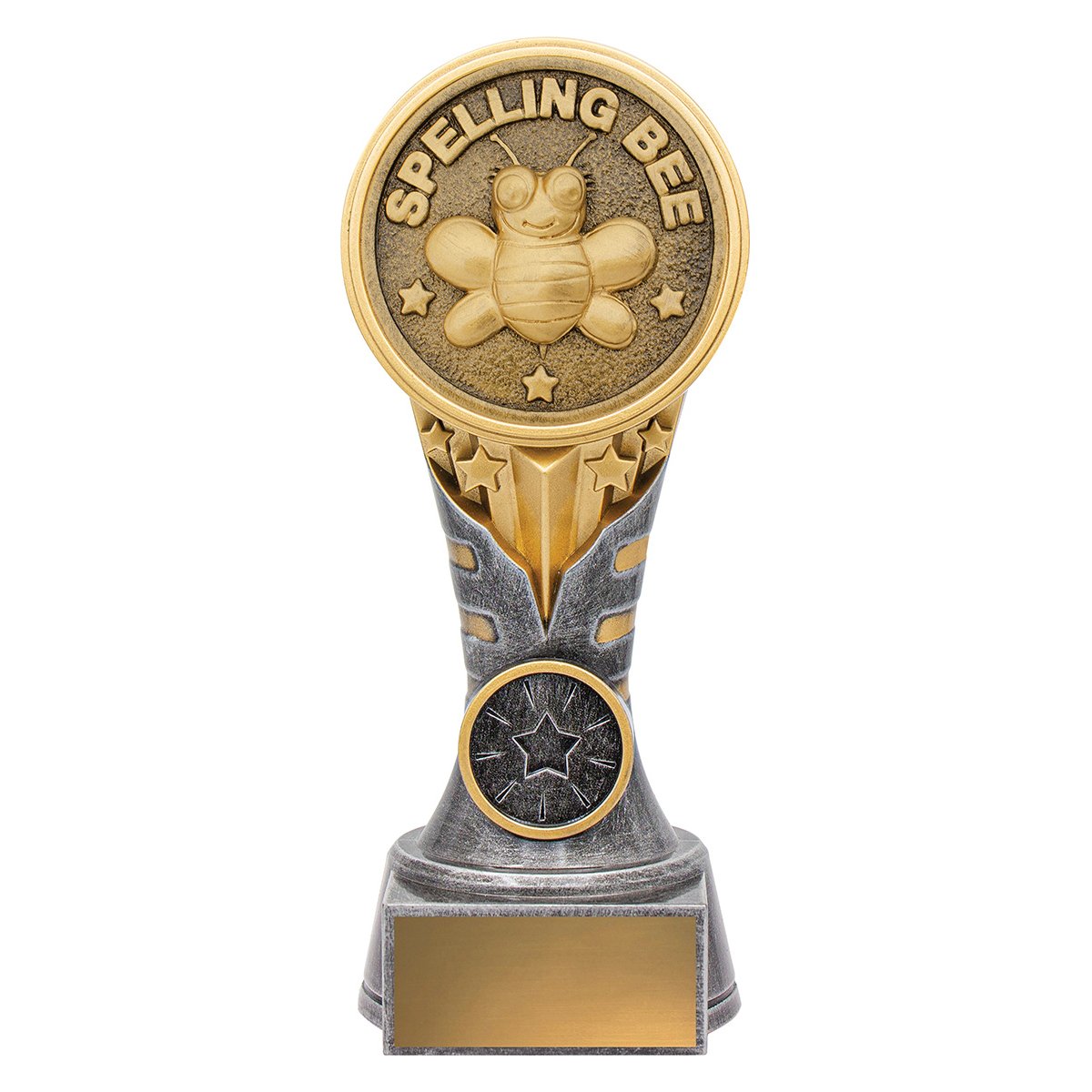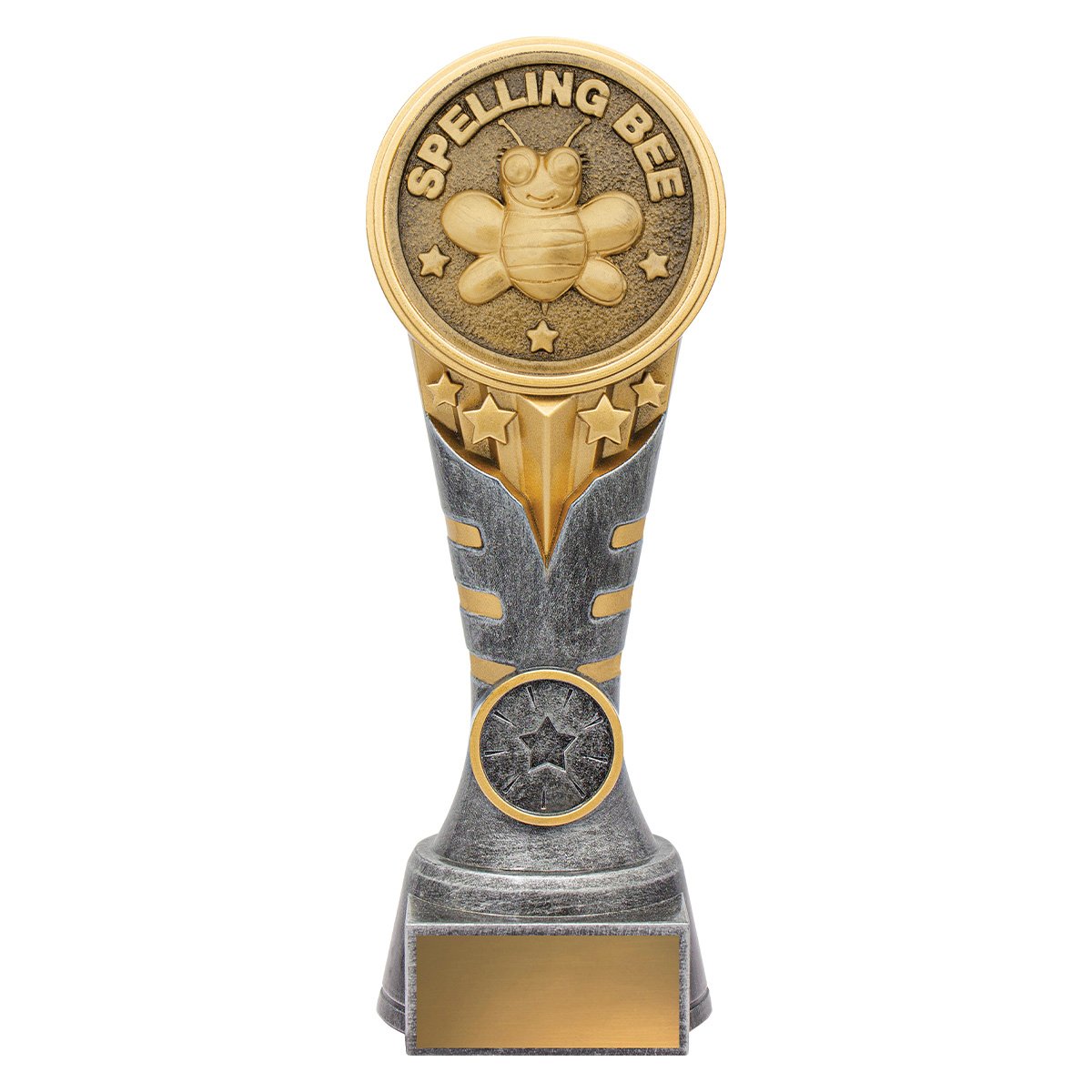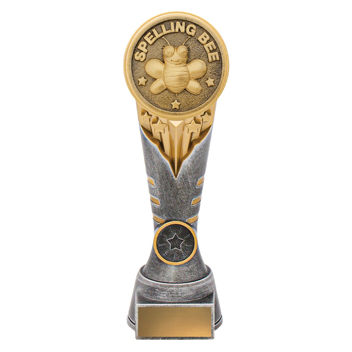 A circular medallion features spelling bee detail within a textured frame, supported by a tapered column base for academic trophies. The consistent insert space and engraving area support academic trophies in Sutherland Shire and Miranda.